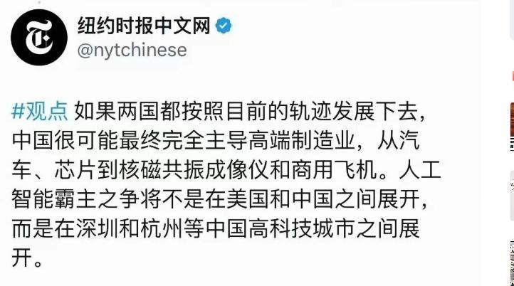 如果两国都按照目前的轨迹发展下去中国很可能最终完全主导高端制造业,从汽车、芯片到核磁共振成像仪和商用飞机。人工智能霸主之争将不是在美国和中国之间展开而是在深圳和杭州等中国高科技城市之间展开。 从最近几年全球对半导体、芯片、通信设备的出口管制来看,西方对中国的科技限制不断升级,门槛设得越来越高。 但就在这些障碍之下,中国并没有止步,反而有些“被逼出来”的创新动力,细看中国的工业基础,从基础材料的自主研发到制造流程的全面数字化,几乎每一个环节都在稳步提升。 全球高端制造业的区域格局正在悄悄发生变化,深圳的业态已经远超过去的“世界工厂”身份,杭州的产业生态也脱胎换骨,苏州、南京等地也在向着高精尖方向拓展。 这不仅仅是一个产业升级的故事,更是技术能力全面扎根本土的现象。 很多人还习惯把中国的制造能力视为低端、模仿为主,这些年已经很少再听到“缺芯少魂”的抱怨。 中国在应用端的人工智能落地速度和创新方式,已经与欧美完全不一样,不只是语音识别、人脸识别、机器视觉这些领域,连在自动驾驶、生物计算等前沿技术领域,中国本土企业都能够做出原始创新。 技术上的突破靠的是自由的市场环境与国际合作,可现实往往是,在压力下更有动力把不可能变为可能。 中国不少企业在“缺技术”的状态下,硬生生逼出了自主可控的供应链,不管是芯片自研,还是生产工艺迭代,许多原本卡脖子的环节都被一项项打通。 至于限制作用多大,看那些被“限制”之后反而加速发展的产业,或许比空气里的争论更有说服力。 半导体、电子、新材料这些行业,虽然确实受到了外部限制影响,进展速度一度变慢,但并没有停下来。 国内科学家团队和工程师们从底层架构到应用层,一道道技术壁垒被突破。 行业里老工程师都知道,有基础就有可能,剩下的就是时间与投入,而中国现在最不缺的就是人才和产业链整合能力。 不妨问问自己,技术突破更多靠的是思路和决心,工具和方法终究能补齐。 说到这里,不由得要关注中国城市间的差异和协同,深圳以硬件为底座,集聚了大量创新资源,迅速成为全球高端制造的先锋。 而杭州则更加注重软件和数据底层能力,两地的企业生态与研发模式都在互相补充。 这样的区域创新布局,为全国产业升级,有很强支撑作用,类似于曾经的“中美科技竞赛”,中国内部正在形成新的“深圳、杭州之争”,甚至苏州、武汉都在崛起。 产业链和技术生态的厚度正在改变全球比较优势,拥抱科技变革,谁能掌握制造业与人工智能的技术高地,谁就能引领新一轮全球经济分工。 外部限制再多,也挡不住中国自主创新的步伐,比如芯片行业,已经不再只是简单的仿制和封装,中国企业正在设计架构、优化算法、完善自主工艺。 新能源车、智能硬件、生物医疗等领域,同样出现了很多“从零到一”的自主突破。 相比时间和资金投入,更值得关注的是团队韧劲和技术知识的积累,这也是为什么越来越多的人开始思考,是不是早晚中国企业会做出任何产品,只不过时机早晚不同。 技术积累多了之后,替代和升级就成了常态,即使一时被卡住,但只要工业体系够厚,技术人才足,创新活跃,“卡脖子”问题就只是暂时的速度放慢,而不是根本阻断。 你怎么看中国高端制造业和人工智能行业的未来? 信息来源:纽约时报中文网