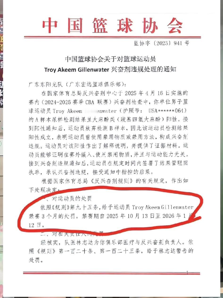 兄弟们!这真的是让人无语啊!刚看到中国篮协下发对广东男篮前外援吉伦沃特的处罚文件!真的是不看不知道!一看真的是佩服广东男篮的能力!厉害呀! 文件展现对广东男篮前外援吉伦沃特服用违禁品处罚为:“停赛3个月,从2025年10月13日至2026年1月12日止”!不知大家看出点什么没有?也就是说这个处罚对吉伦沃特来说,如果下赛季他想参加CBA联赛的话,只需停赛1个月!神奇不神奇!我真的佩服能想出这个处罚决定的人!因为CBA联赛是从12月12日才开打!也就是说吉伦沃特下赛季依然可以回CBA打球!只要有球队愿意签!我想广东男篮会迫不及待的签他回来!因为服用违禁品对广东男篮来说那都不算事!太厉害了![赞] 辽宁球员打架中国篮协给停赛3年!国际篮联对球员打架仅停赛几场比赛!广东男篮外援服用违禁品中国篮协仅停赛3个月!中国篮协厉害[赞]!服了!这TM的真拿球迷当傻子!太TM的欺负人了!你怎么看呢?