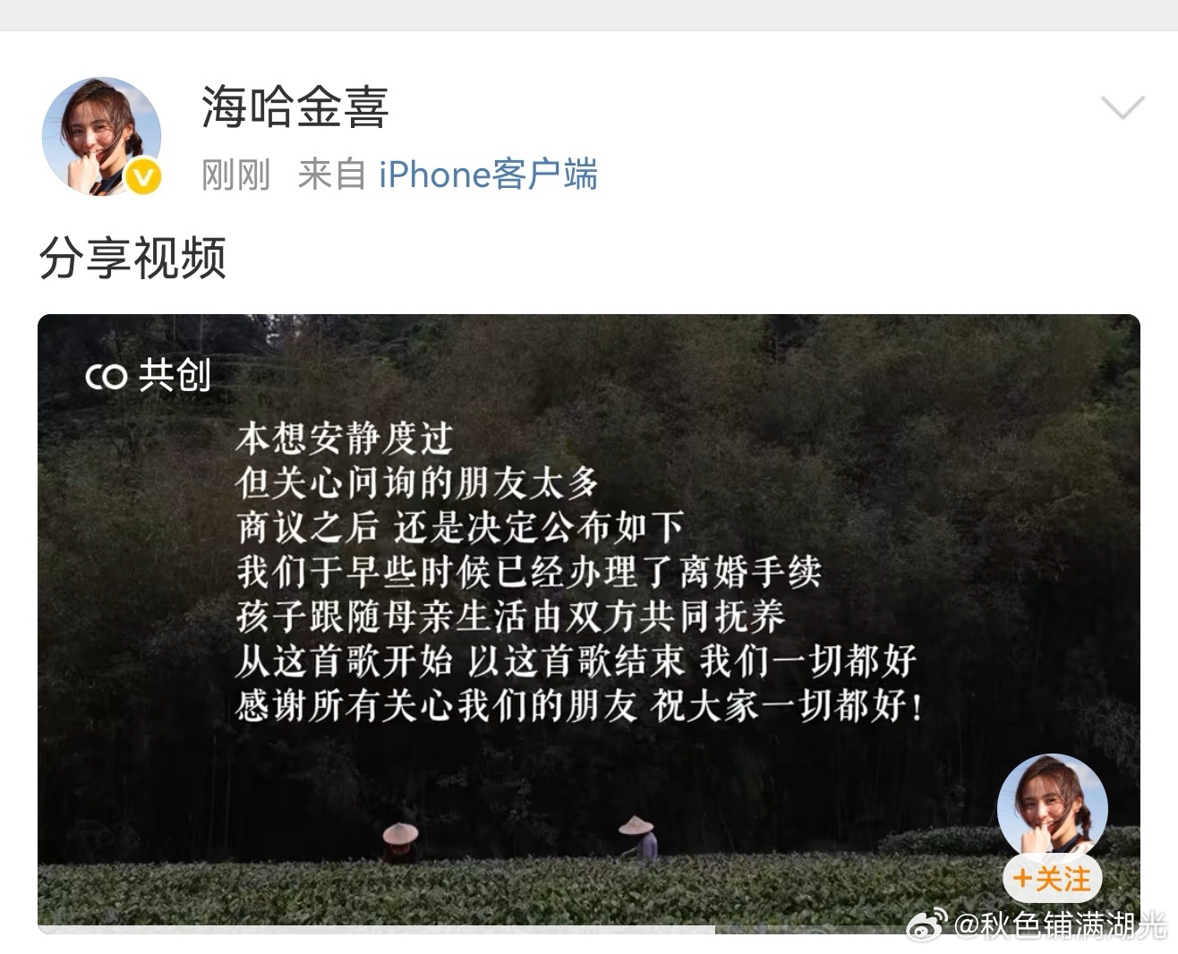 李亚鹏和海哈金喜公布离婚消息,孩子随母亲生活
