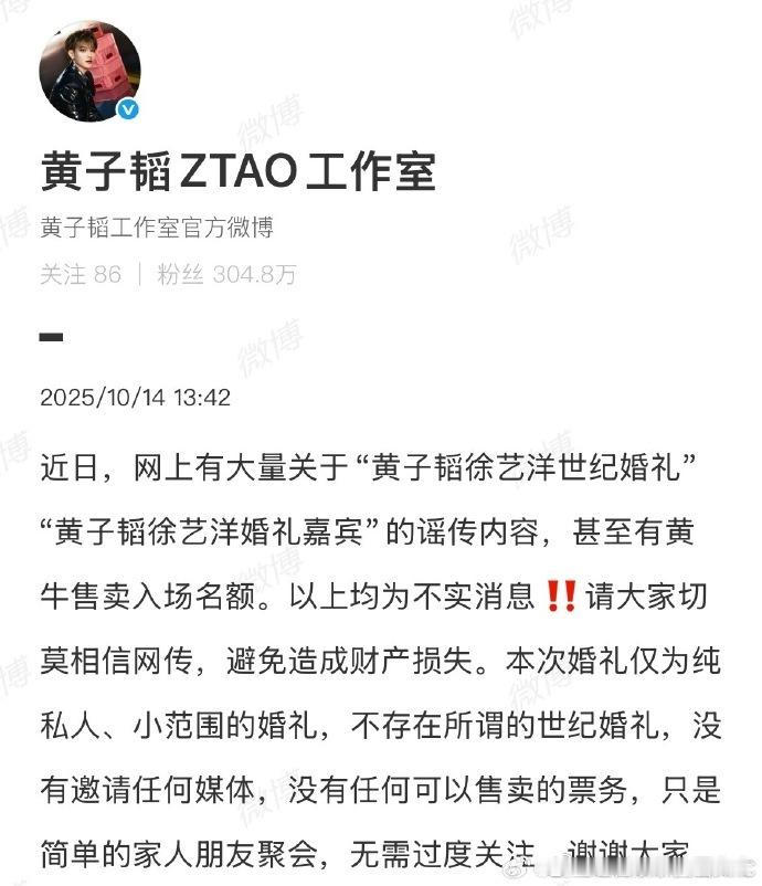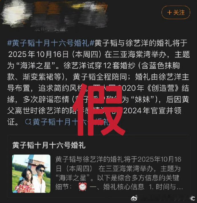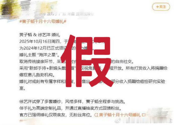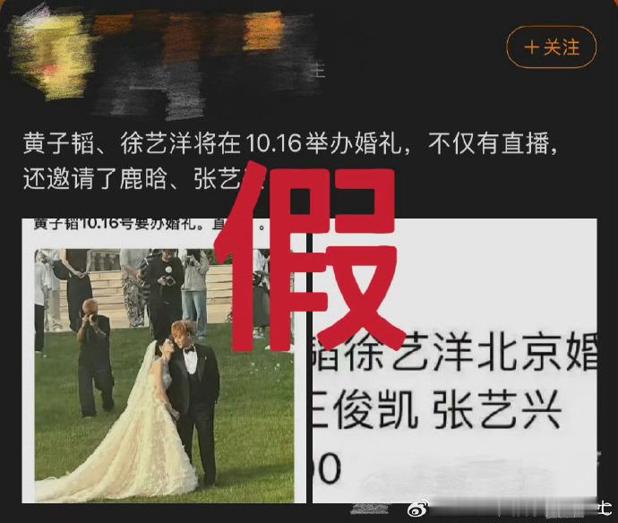 黄子韬徐艺洋婚礼没有邀请媒体婚礼谣言全粉碎!工作室称嘉宾传闻假,未邀媒体,无售票,黄牛名额纯属诈骗。