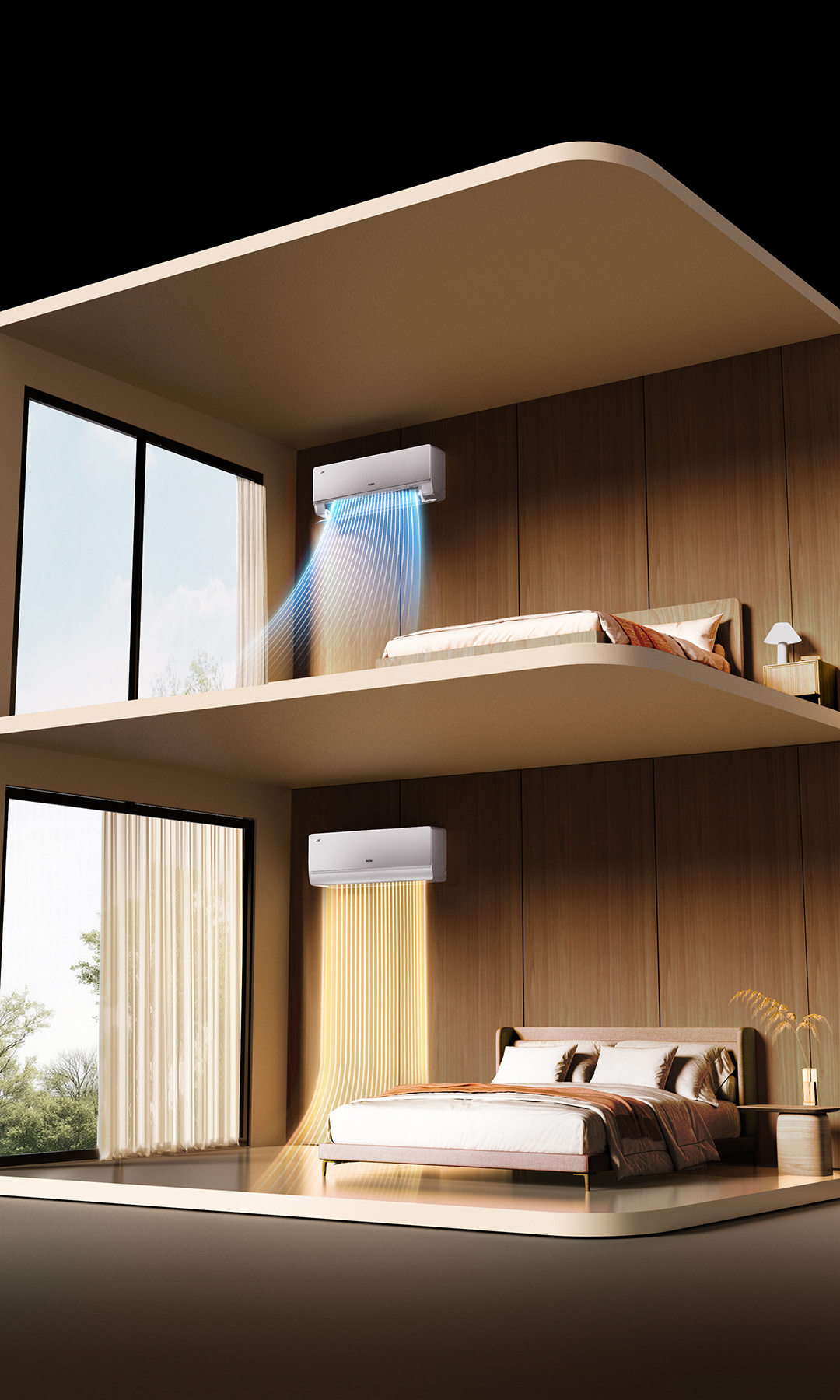 双风口康达送风:冷风上扬30°防直吹、暖风垂降90°暖脚,820m³/h大风量配合15秒速冷、30秒速热,快速均衡室温。
