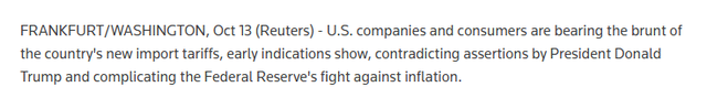 “早期迹象表明,美国企业和消费者正承受着美国新关税的冲击,这与美国总统特朗普的说法相矛盾,并使美联储抗击通胀变得更加复杂。”