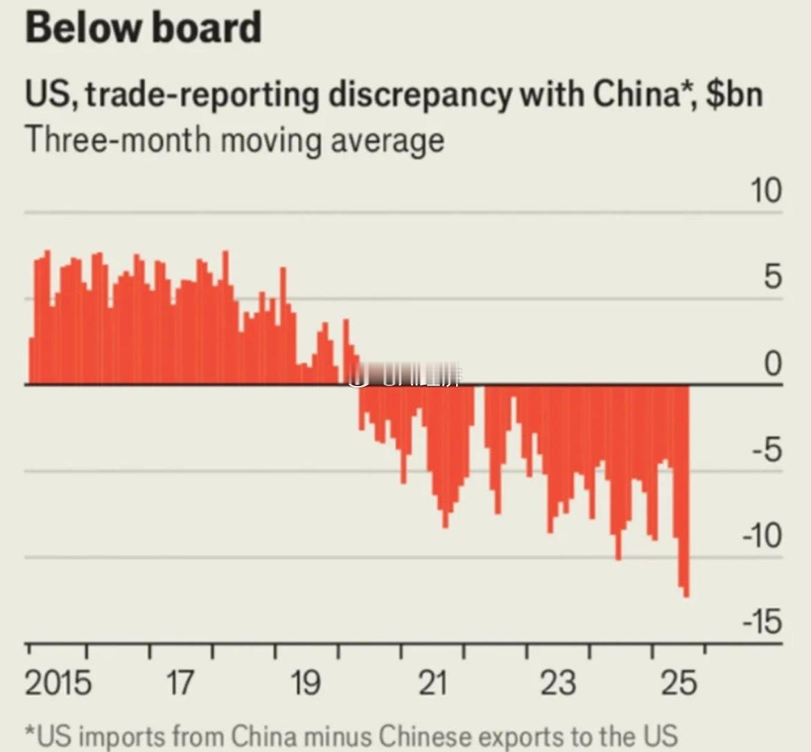 经济学人 美国进口商在向海关申报时,正在系统性地低报来自中国的商品价值。这一操作直接导致中美双方的贸易统计出现了巨大差异,美方记录的月度进口额相较于中方记录的出口额的差距不断扩大,目前每月已平均低出超过100亿美元。