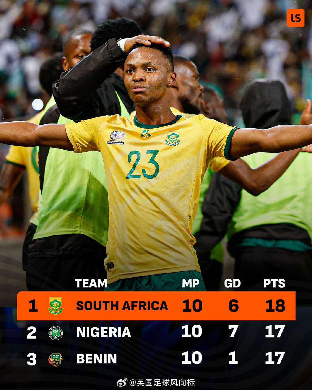 非洲大国南非,力压同组的尼日利亚,成功从世预赛非洲区C组出线,成为第23支获得2026世界杯入场券的球队。