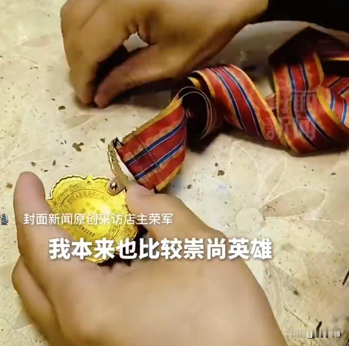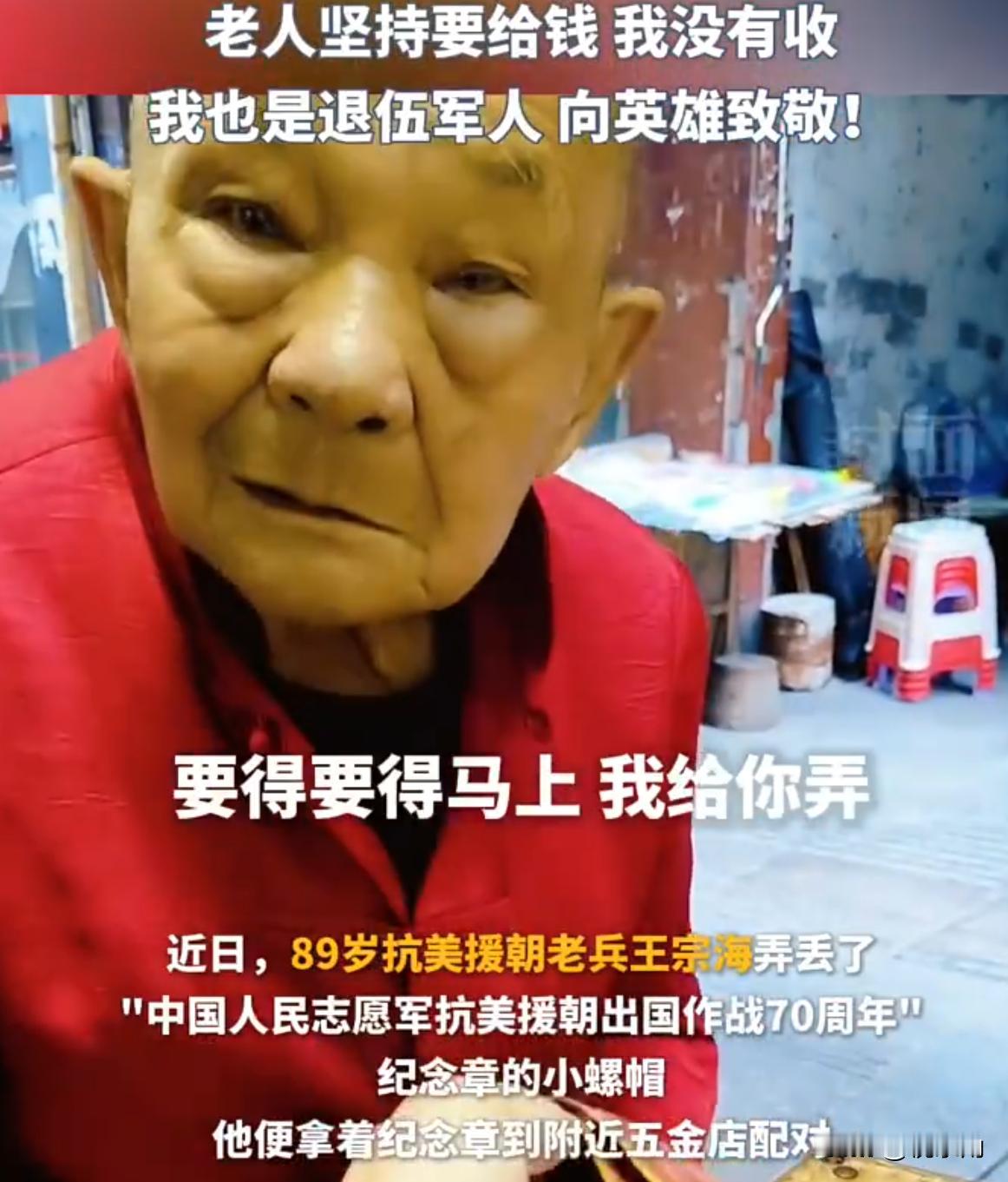 看哭了!四川资阳89岁抗美援朝老兵王宗海拿着纪念章走进五金店,就缺个螺帽。暴雨中,店主荣军跑遍全城找零件说:“不给他找到,我坚决不罢休!”老人掏钱,他却摆手拒绝。谁知,店主荣军也是位退伍军人。 那天下午,五金店里来了一位老人。店主荣军抬头看了一眼,愣住了,老人弓着腰走得很慢,手里紧紧地捧着个东西,走到柜台前,老人才松了口气,把手里的东西轻轻放下。 原来他手里捧着的是一枚纪念章,金色的,有些褪色,但擦得很干净。 “你好,能帮我修修这个纪念章吗?就缺个螺帽,掉了。” 店主荣军接过纪念章,心头一震。这可不是普通的纪念章呀,上面还刻有“抗美援朝”四个字,他下意识地挺直了腰板准备给老人修。 “您稍等,我找找看。”他转身打开工具箱,从几百个螺帽里挑来挑去。不对,都不对。这纪念章的螺丝孔是老式规格的,现在根本不生产这种尺寸了。 “大爷,您这个尺寸有点不好找,店里暂时没有,不好意思哈。”他刚说完,看见老人眼里闪过一丝失落,那种失落让他心头一紧。老人没说话,只是盯着那枚纪念章,手指在桌上轻轻画着什么。 就在这时,外面下起了大雨,店主突然对老人说:“大爷,你先回去,这事包我身上了。” “真能找到吗?”老人抬起头,眼里有了光。 “你放心,一定给你找到,我找不到它我坚决不罢休。” 老人走后,他立马锁上店门,撑起伞就冲进了雨里。 很多人可能不理解,为了一个螺帽,至于吗? 但店主荣军心里很清楚,他自己也是当过兵的,那不单单是个螺帽,那是一位老兵守了70多年的荣誉。要是修不好,老人得多难受啊。 他先去了附近的五金店,没有、又跑到建材城找还是没有,好多人都摇头说这种老规格螺帽早就不生产了。 有人劝他说让他随便找个差不多的凑合着先用呗,反正老人家也看不出来。 他听到这话,脸色沉了下来说:“那可不行,这不能凑合,那是一枚纪念章,不是普通的工艺品,对老兵来说,那是用命换来的啊,怎么能凑合呢?” 他不死心,没想到终于在一家店里找到了那种螺帽。一位上了年纪的老板从库房里翻出一盒陈年货:“你要的是不是这个?这都是我几十年前的存货了。” 他接过螺帽,仔细对比看着,尺寸完全吻合,他当场付了钱后,转身又冲进雨里,回到店里,他坐下来戴上了老花镜,一点点把螺帽拧上去,动作很轻也很慢,生怕弄坏了。 到了第二天,老人来取纪念章。他看到修好的章子,老人眼眶红了。他颤抖着从口袋里掏钱给他:“小伙子,多少钱?” “不要钱。”店主荣军把纪念章递过去。“那怎么行,你跑了一下午,还下着雨。”老人坚持要给他钱。 他摆摆手,突然立正站好,敬了个军礼说:“我也是个退伍军人。能为老前辈做点事,是我的荣幸。” 老人愣住了,也颤巍巍地举起手回了个军礼。 那一刻,五金店里很安静。两代军人,就这么站着,谁也没说话,但空气里有种说不出的温暖。 有人说为了一个不收钱的活儿,冒雨跑半天,耽误生意值得吗? 他却说:“我当过兵,知道纪念章对老兵意味着什么,那是他们用命换来的荣誉,我能帮就帮,这不是钱的事儿。” 你看,这就是军人的样子,虽然自己退伍了,军装脱了,但骨子里的那股劲儿却一辈子都在。 王宗海老人守了70多年的纪念章,店主荣军用一个下午的奔波帮他守住了个完整的章子。 这不只是修章子,这是在守护一种精神。一种我们不该忘记的价值观。一个螺帽不到1克,但尊重和传承却重过千斤啊!有些坚守不需要理由,只需要一颗懂得的心。 你觉得店主荣军做得值不值?如果是你会怎么选? 素材来源:封面新闻