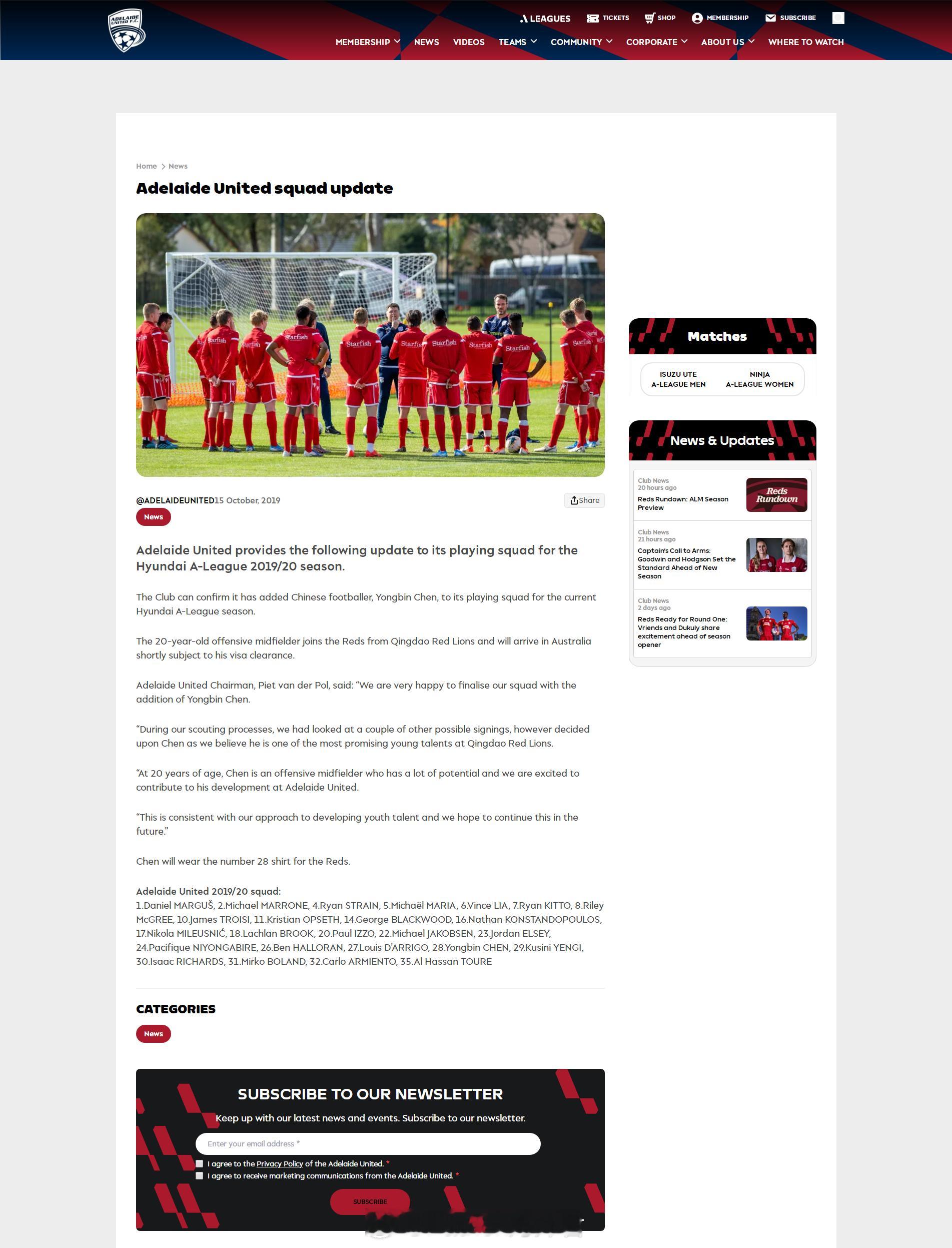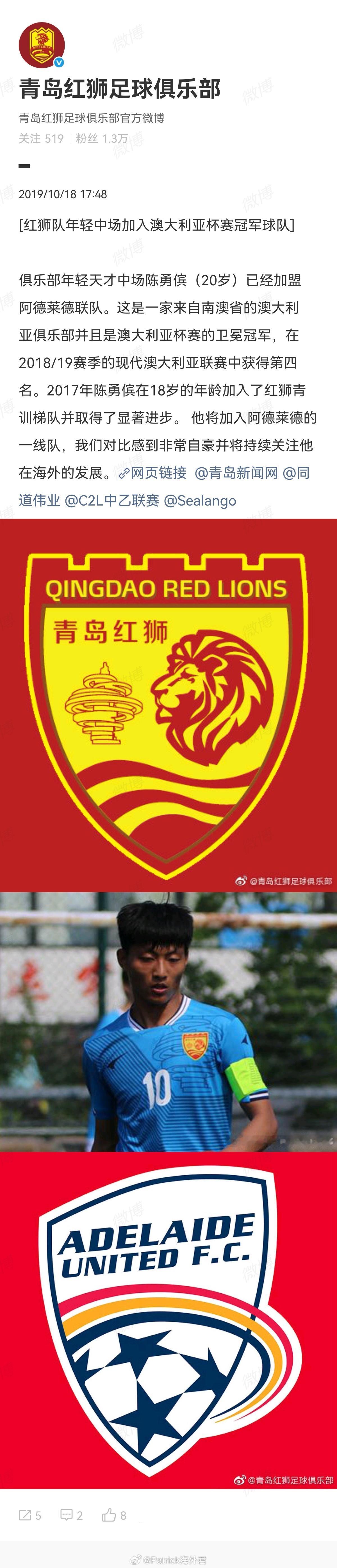 留洋今日 六年前的今天,20岁中场陈勇傧从青岛红狮加盟澳大利亚阿德莱德联队,身披28号球衣,他此前活跃于青岛业余联赛和五人制赛场,从未有过职业联赛经历。效力阿德莱德期间,陈勇傧仅在U21青年联赛替补出场3次,未进入过一线队大名单。