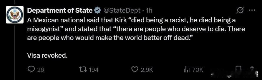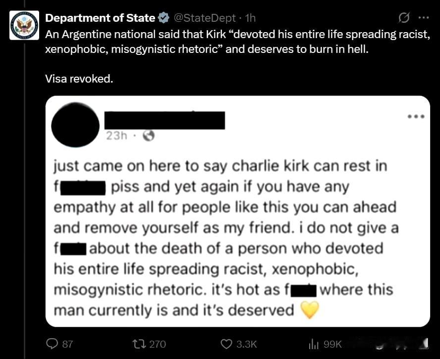 除了德国公民马里奥·西克斯图斯之外,美国国务院还吊销了来自阿根廷、巴西、墨西哥、巴拉圭和南非的五名外国人的签证,原因是他们发表言论嘲讽或庆祝查理·柯克惨遭暗杀。 一名阿根廷公民表示,柯克“毕生致力于传播种族主义、仇外心理和厌女症言论”,应该下地狱受刑。签证被吊销。 一名南非公民嘲笑那些为柯克的逝世而悲痛的美国人,称“种族主义集会以企图殉道而告终,他们为此感到伤心”,并指控“他被用来为白人民族主义拖车垃圾运动做宣传”。签证已被吊销。 一名墨西哥公民称柯克“死于种族主义,死于厌女症”,并表示“有些人活该去死。有些人死了会让世界变得更好”。签证已被吊销。 一名巴西公民指控“查理·柯克是纳粹集会游行向他致敬的起因”,并称柯克“死得太晚了”。签证已被吊销。 一名巴拉圭公民指控“查理·柯克是个混蛋,他按照自己的规则死去”。签证已被吊销。 所有个人信息均已隐藏。 谁说的美国有着良好的言论自由?