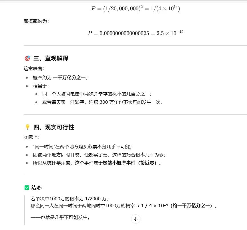 这个人上辈子一定是拯救了银河系吧,不然怎么会有这么好的运气。10月14日湖北孝感与江苏南京两地体彩中心相继宣布各有1000万元巨奖诞生,看着觉得挺正常,离谱的是中奖者是同一个人。我用chatgpt简单算了一下中奖概率,低的吓人,大概是千万亿分之一。也不怪公众怀疑可能存在暗箱操作,人为操纵。就这概率,谁看都得犯迷糊。如果没有问题,那这个人一定是幸运之神转世吧。 真让人羡慕,我也买了三四年彩票了,从来没中过大奖,都是5块5块钱的中[泪奔]。啥时候幸运之神能眷顾眷顾我啊。彩票 彩票中奖