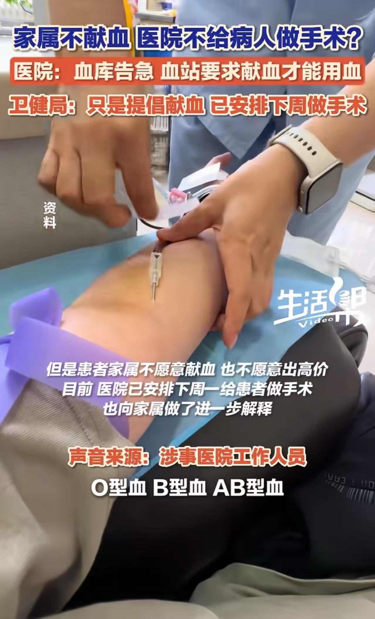 卫健局的工作人员也对此事发表了看法。他们称,目前血库的血液确实处于紧张状态,但并没有强制要求患者家属献血,只是提倡大家献血。如果家属愿意献血,那么用血的费用会相对低一些。而这个患者家属既不愿意献血,也不愿意出高价购买血液。不过,目前医院已经做出了安排,计划在下周一为患者进行手术。