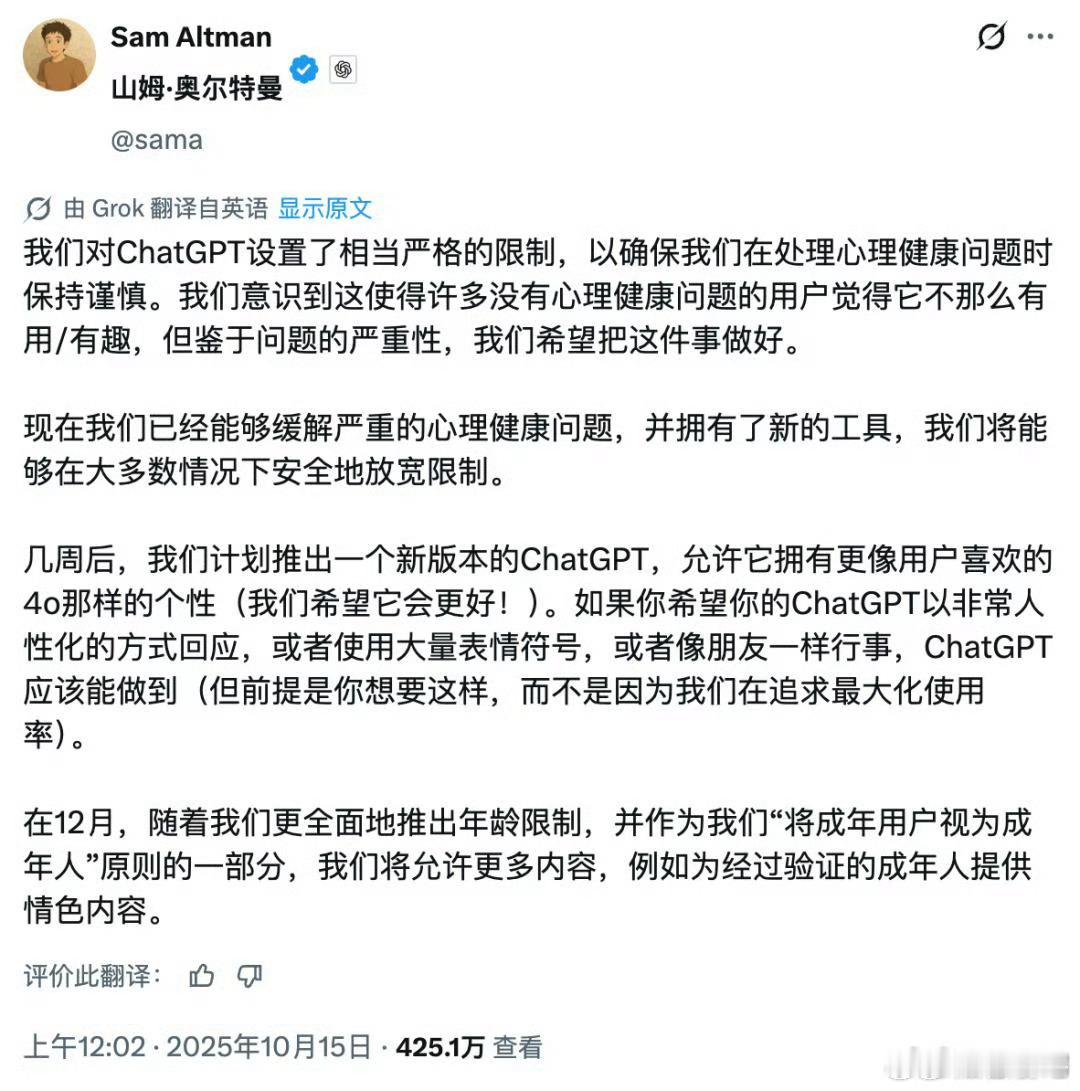 不过它应该不会像Grok那样弄个虚拟女友,更可能做点正经的成人内容分析,比如帮平台审核敏感内容,或者做医疗健康咨询这类刚需服务。 ​​​