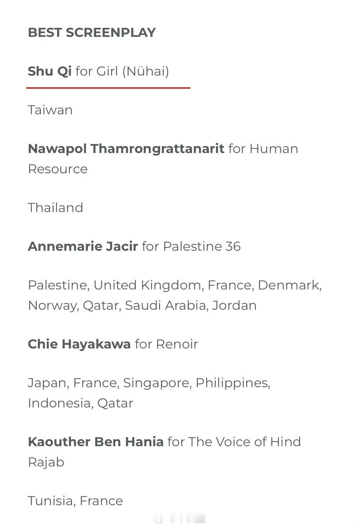 终于有一个奖记得「女孩」这部电影是舒淇自编自导的了,恭喜舒淇提名亚太电影大奖最佳剧本奖,也是一份非常重要的认可。
