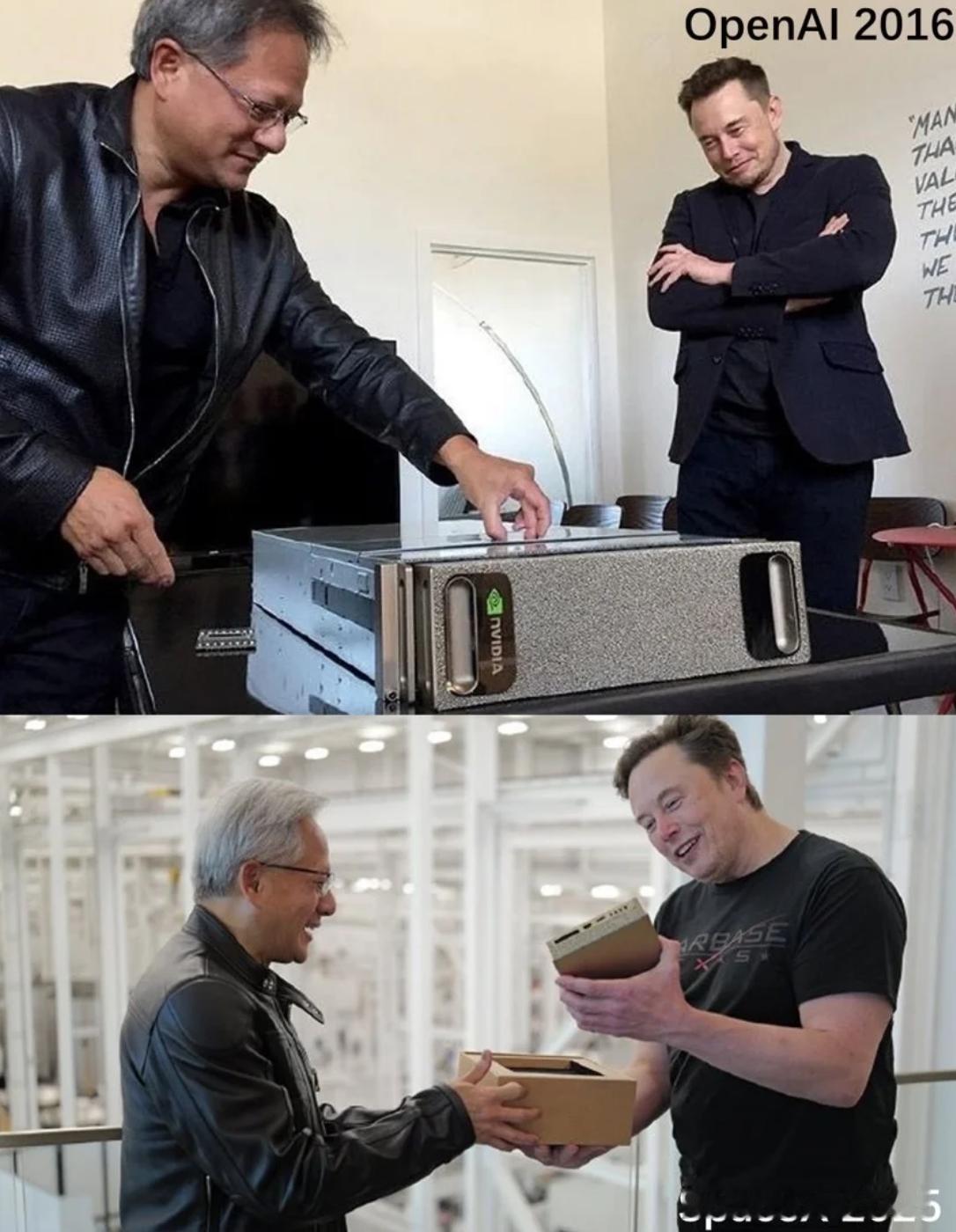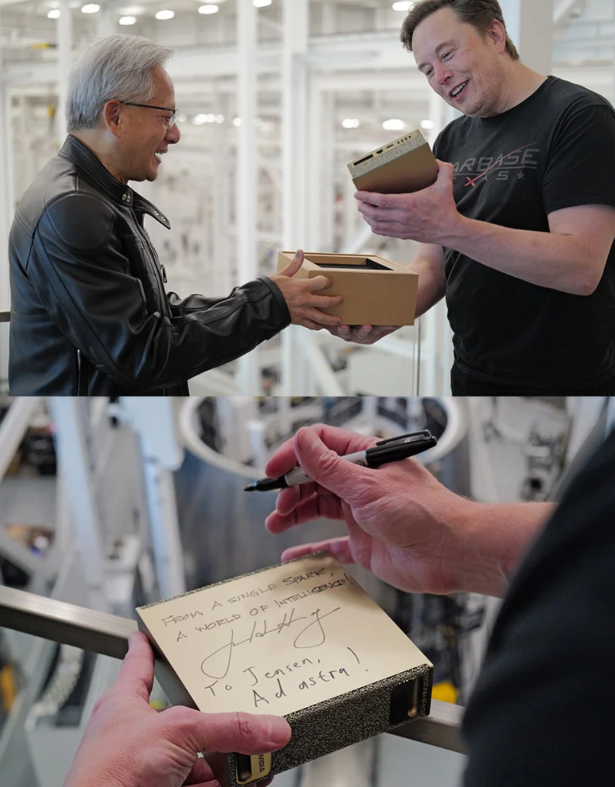 2016 年,黄仁勋把第一台 DGX-1 送到 OpenAI;2025 年,他亲手把 DGX Spark 交给 SpaceX。