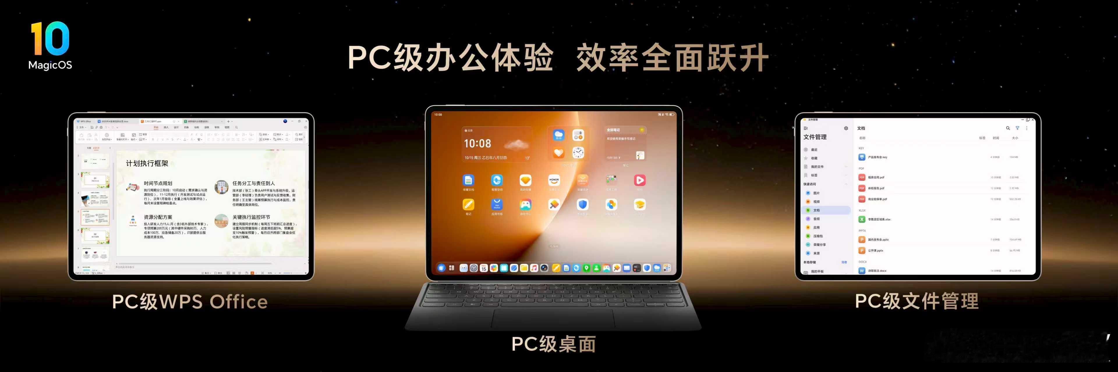 MagicOS 10实现PC级办公体验,行业独家支持一键排版,AI会议实时生成纪要及待办事项,智能识屏即时响应查询,AI体验全面升级。