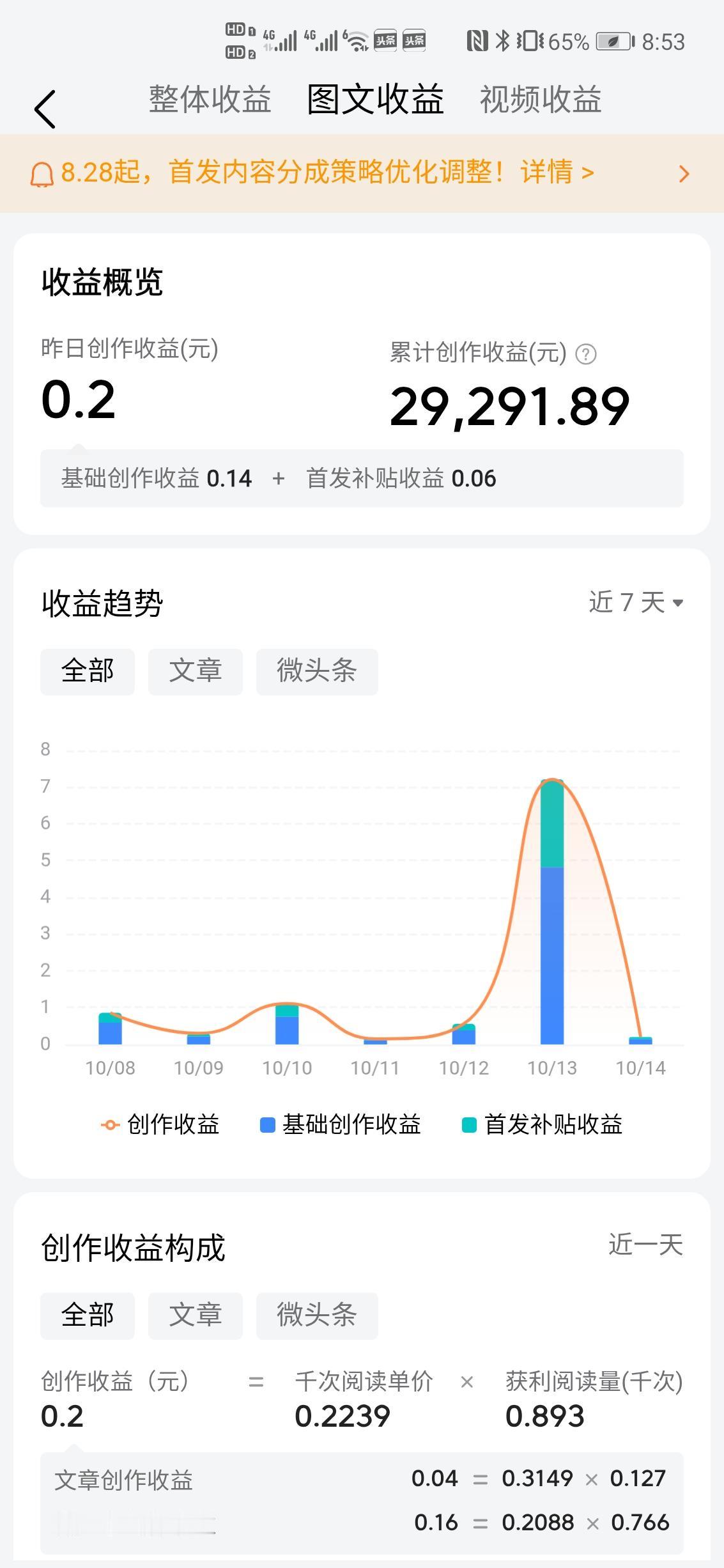 今天我的头条千次阅读单价竟然高达0.22元,真的是高出了新高度。而且阅读量也少得出奇,连别人一个小作文的展现量都达不到。今日头条还能写吗? 从2022年3月开始写头条,用了一年左右的时间,粉丝达到了2万多,收益也基本保持在每个月2000元左右。 可惜的是,2023年单位上对在自媒体上创作要求严格了,虽然我从没有写什么出格的小作文。但最终还是响应单位号召,几乎断更。 随便一段时间,头条也是时断时续,展现量,阅读量持续下滑。 等再次拾起的时候,发现今日头条早已是城头变化大王旗。好几个熟悉的写手已经不写了,当然也有在努力坚持的,但看她的文章,感觉每天上三位数几乎是没有了。 遥想2022年,头条上只要努力,上三位数还是很容易的,包括2023年、2024年还是有可能的,但今年好像就难搞了。 可能是写的人越来越多了。以前汽车征文,一个征文也就三四千人参加,后来发展到七八千,现在几乎都是三四万人参加。 奖金还是那么多,可参加的人越来越多,而且要求越来越高。 深入分析,可能还是和大的经济形势有关,大家收入少了,于是头条便成了一个创收的渠道。 还有就是经济下行,头条的广告收益也在下降,收益少了,可以给大家发的钱也就少了。 不过,不管形势怎么变,还是要记住的自己的初心,来头条不单是为了那几个三瓜两枣,更多是把他当成一个展示自己文采或表达心情的平台。 再看后台那 0.22 元的千次阅读单价,和寥寥无几的阅读量,难免会想起 2022 年写头条的日子 —— 那时粉丝涨得稳,月入 2000 元不算难,认真写篇文,日入三位数也容易。 后来因单位要求断更,再回来时,熟悉的写手少了,流量规则变了,连汽车征文都从几千人参与涨到了三四万,收益自然被摊得更薄。 说到底,这背后是大环境的影响:大家想靠头条多份收入,平台广告收益也受经济下行波及。 但转念一想,当初来头条,本就不只是为了那点稿费,更多是想找个地方写点东西、表达自己。 流量会起伏,规则会变化,但文字的价值、表达的快乐不会变。就像有人说的:“创作不是追着流量跑,而是守住心里那片愿意动笔的角落。”