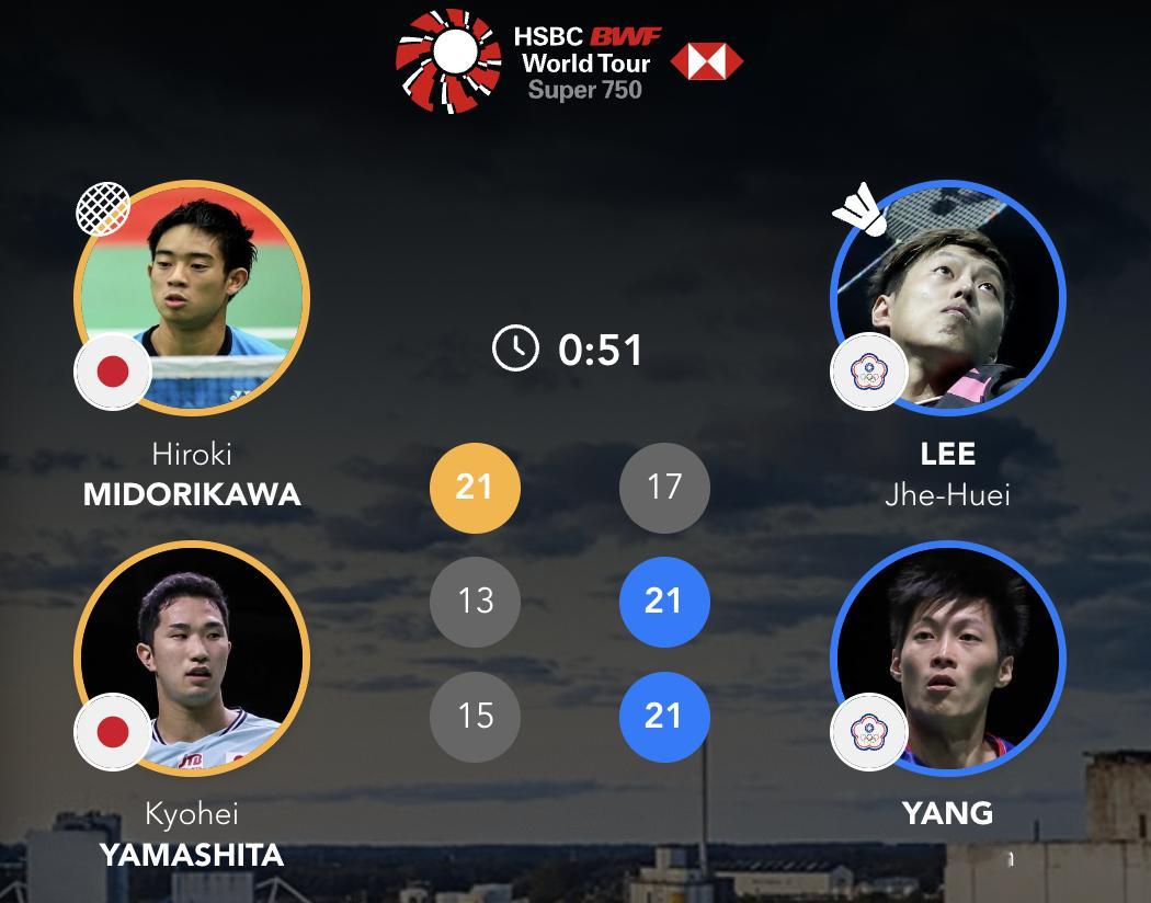 李哲辉/杨博轩 17-21、21-13、21-15 🇯🇵绿川大辉/山下恭平