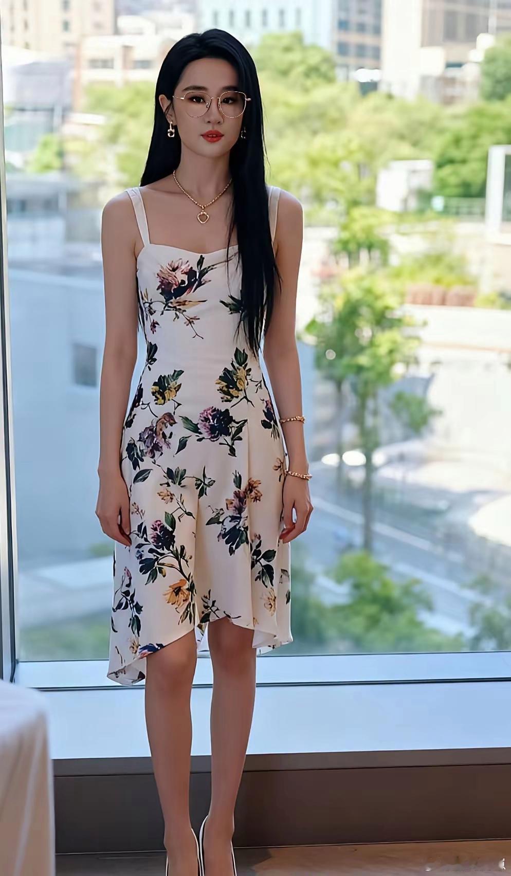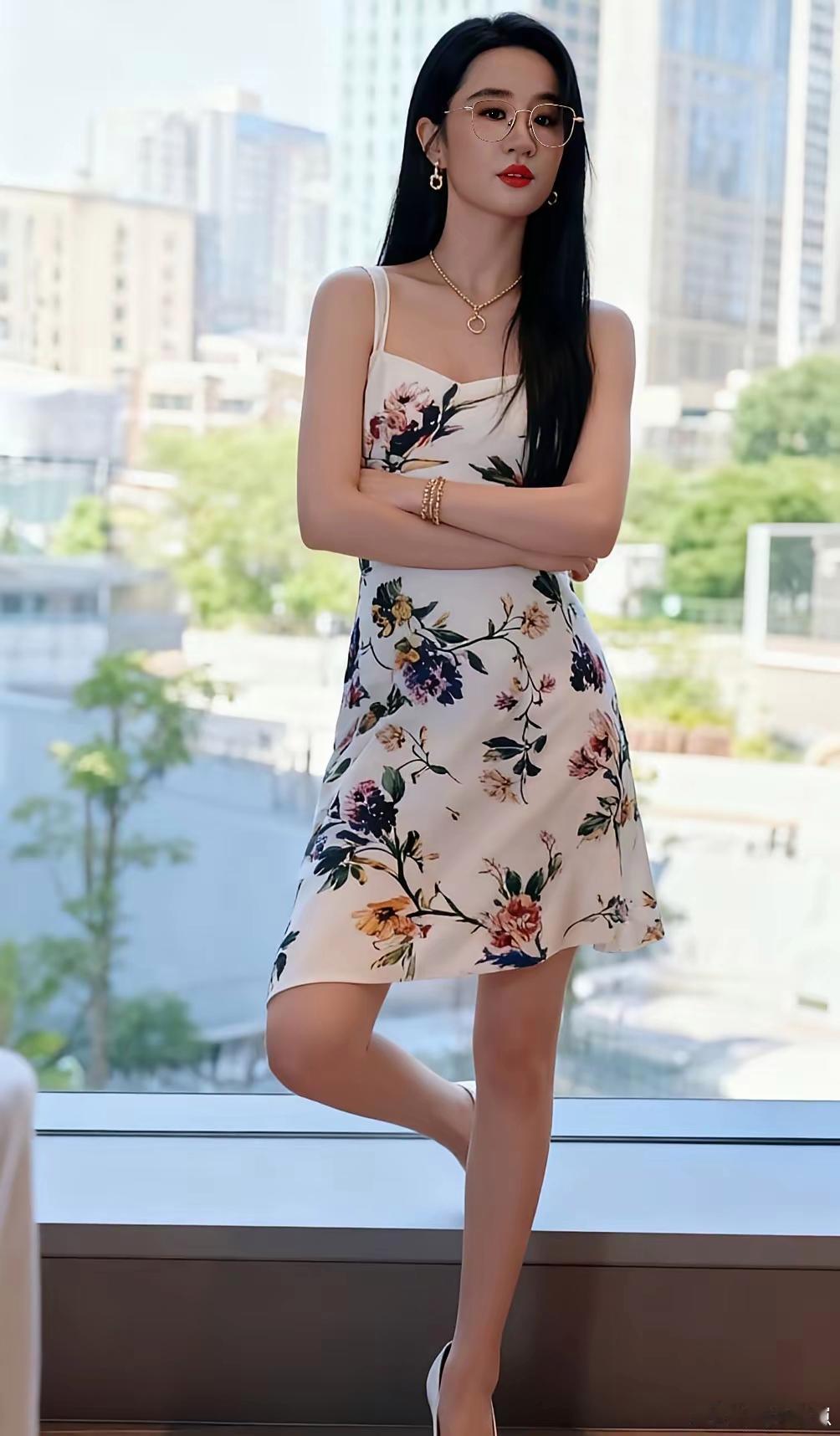 刘亦菲身着碎花连衣裙,搭配一双白色高跟鞋,整体造型优雅得体,将那份独特的知性美展