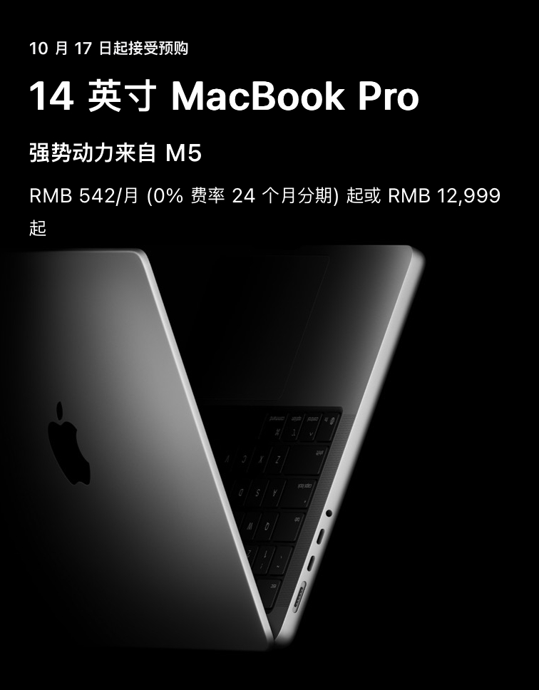 苹果官网刚刚发布了一款14英寸的MacBook Pro!搭载 M5芯片,10月17号开始预售、10月22发售新品驾到