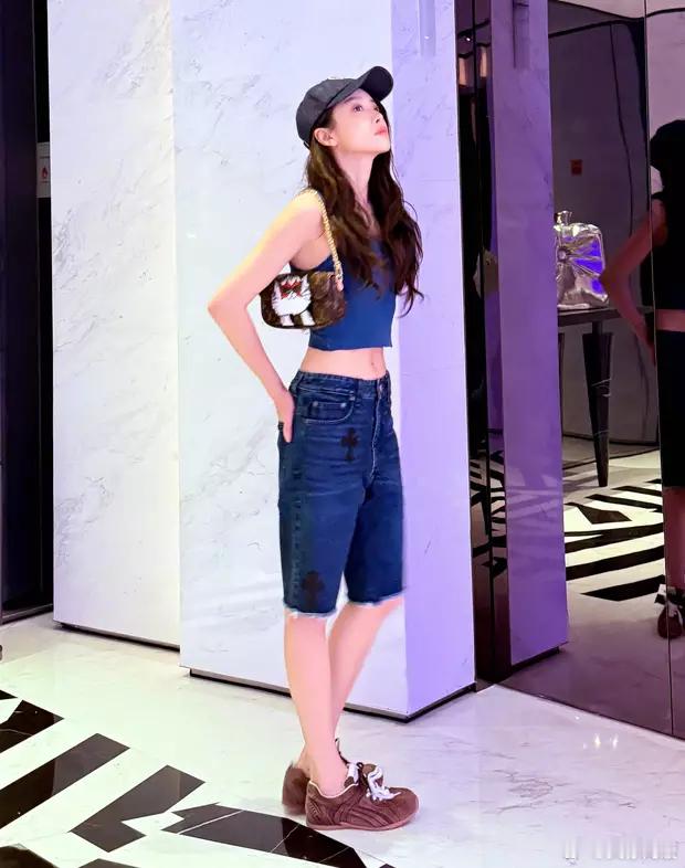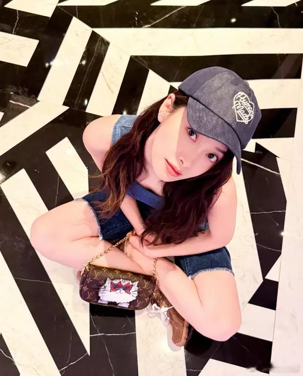 分享娱乐[超话]分享娱乐 宋茜戴棒球帽,穿蓝色背心配牛仔中裤,姿态随性,满是休闲时尚感。