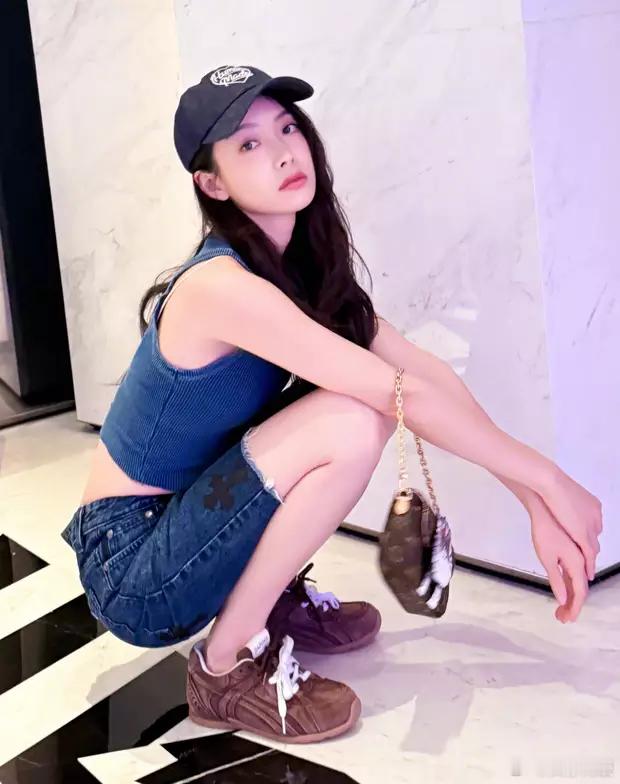 分享娱乐[超话]分享娱乐宋茜戴棒球帽,穿蓝色背心配牛仔中裤,姿态随性,满是休闲