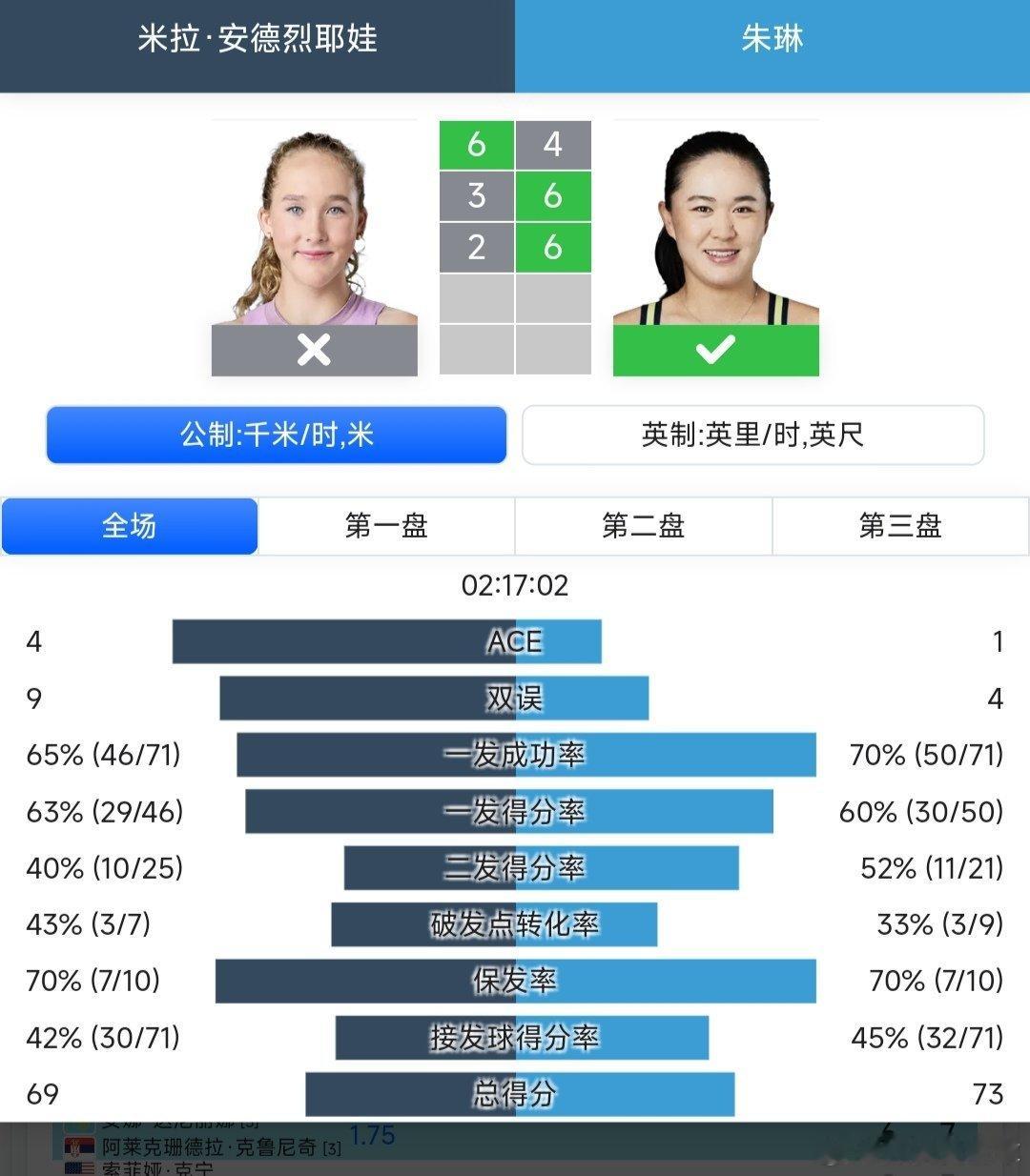 外卡参赛的朱琳🇨🇳4-6/6-3/6-2逆转战胜头号种子米拉-安德列娃🇷🇺,晋级8强,恭喜朱琳!🎉🎉🎉