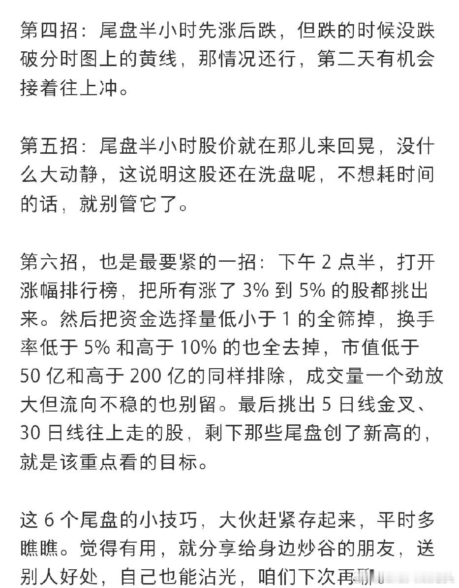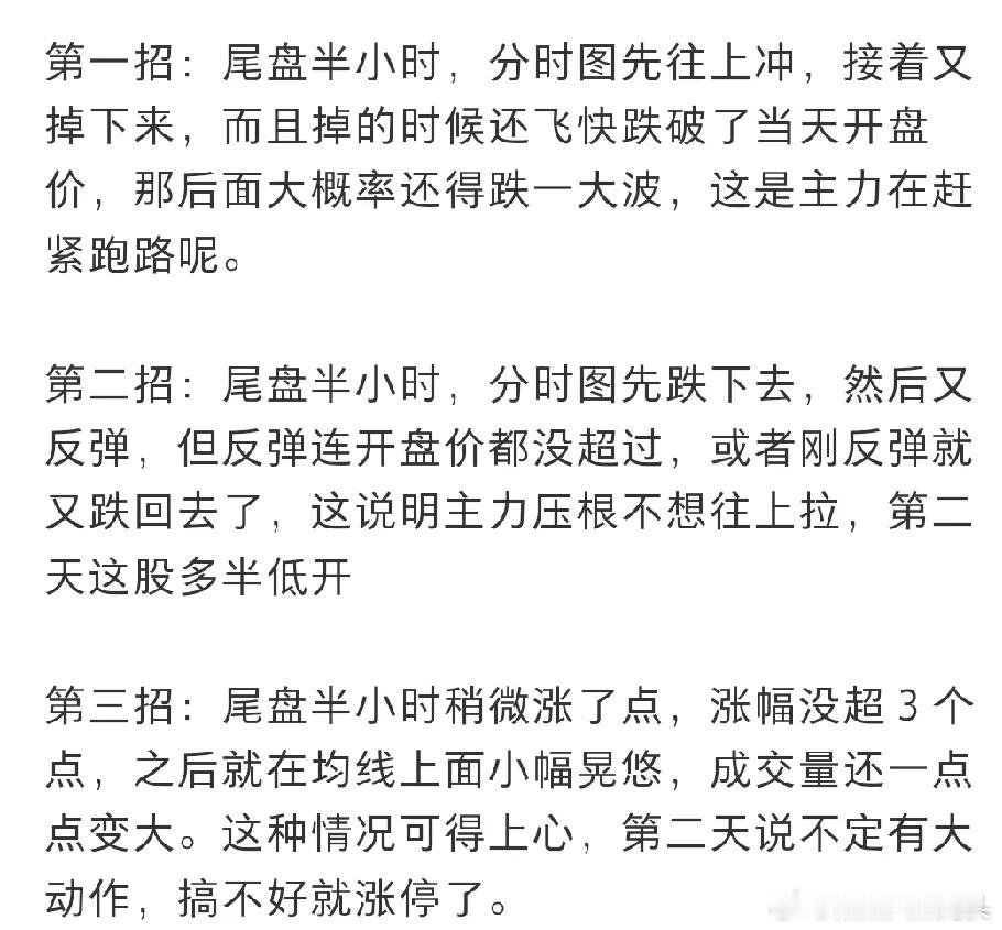 1. 看“收尾动作”:若尾盘30分钟稳步上涨,成交量慢慢放大,像宴席结束时主人加菜留客,是真看好,次日上涨概率高;若突然急拉又回落,像假热情催客走,多是诱骗跟风,次日易跌;若快速跳水跌破关键价位,像主人摔杯离席,大概率要“冷场”。