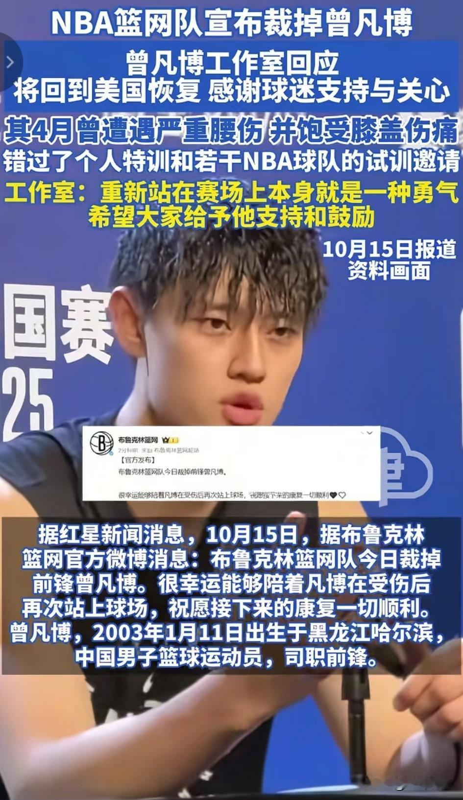 中国球员曾凡博真的惨, 刚帮NBA中国赛造势卖票结束, 就在10月15号被篮网扫