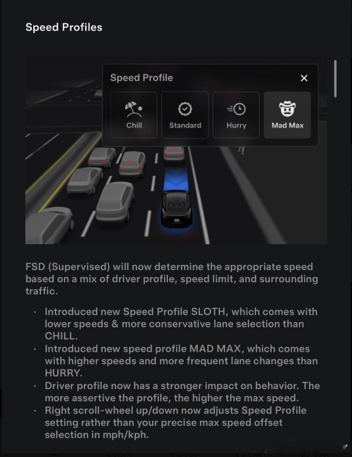 特斯拉FSD新上线了疯狂麦克斯(Mad Max)模式,它代替了原本的 "HURRY" 模式,听这个名字你就知道,它在变道和速度方面有多激进了[doge]