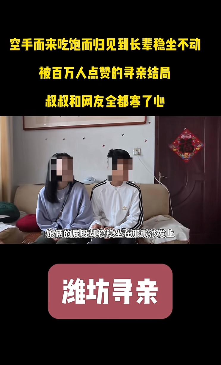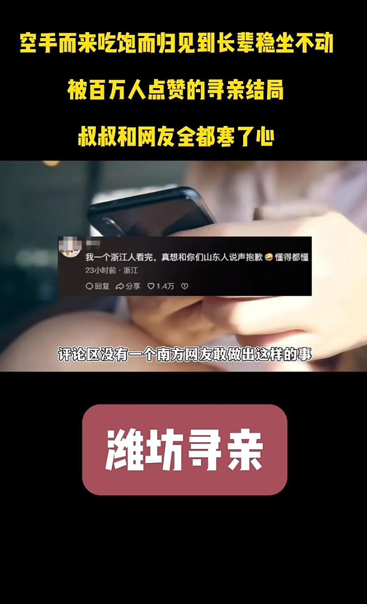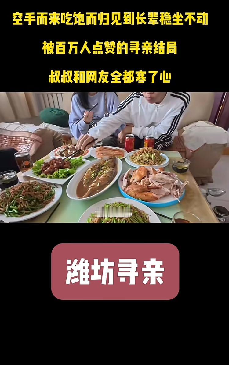百万网红前往山东潍坊寻亲,堂叔一家热情款待了他们。然而,他们没带礼物,菜一上桌便直接开吃,此举遭到全网批评,被指没礼貌。有人搬出老传统调侃:穷人小心翼翼的大方,富人大大方方的小气。 也有人称这是南北方的差异,我认为这种说法有误。山东作为礼仪之邦,向来极为重视亲情,亲戚到访定会拿出最好的东西招待,这固然没错,但这并不意味着南方人就小气、没礼貌。以南北差异来解释此事并不恰当。 我觉得这实则是上一辈人与当代年轻人之间的差别。如今大家庭团聚,总是一群长辈忙前忙后,年轻人却坐在一旁玩手机、打游戏,无动于衷。长辈们做饭、拿碗筷、上菜、摆水果,年轻人拿来就吃,全然不顾他人,一副理所应当的模样。当代年轻人被宠坏了,不懂礼节。 此次寻亲现场呈现的,正是不太懂礼貌的青年人与热情好客的老一辈之间的反差。 不过,博主能够千里寻亲,也证明博主是一个重亲情的人。