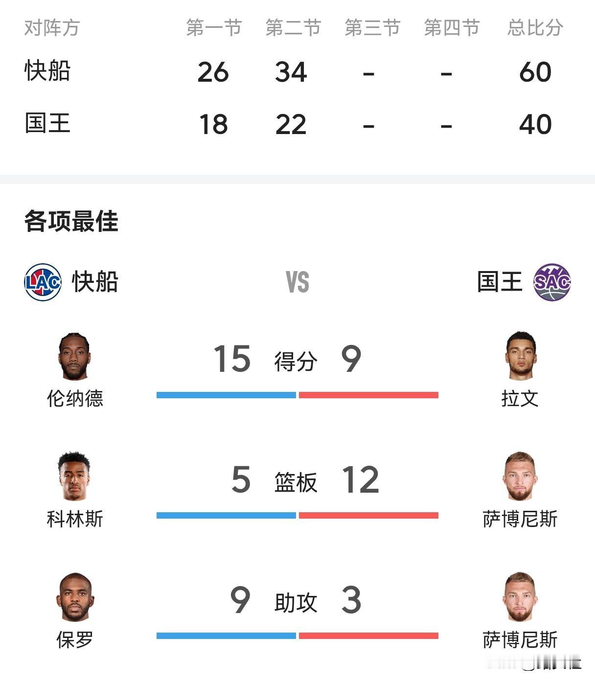 替补抢眼!快船半场领先国王20分 今天季前赛,快船在客场挑战国王。半场结束,快船以60-40领先。 上半场,快船替补表现神勇,5人合计投篮14中12砍下33分,主力仅得到27分。 替补队员中,科林斯得到11分,洛佩兹12分,邓恩4分,保罗3分,巴图姆3分。
