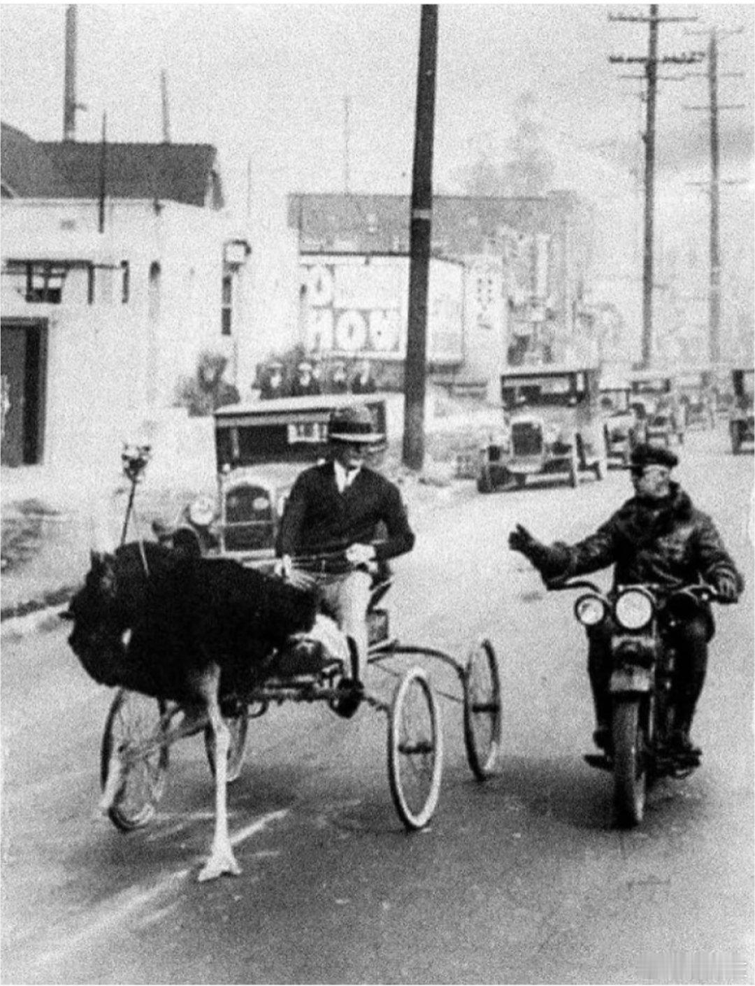 鸵鸟车因超速,被警察拦下场景,拍摄于1930年洛杉矶