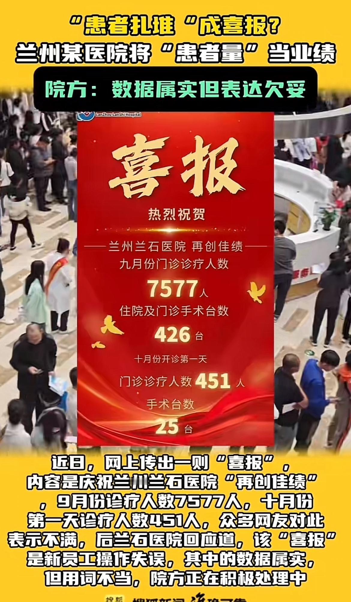 患者扎堆居然成了值得庆贺的“佳绩”?兰州这家医院的操作真是让人看不懂。明明是承载着病痛的患者数量,到了医院这里却变成了用来炫耀的业绩,一纸喜报把医疗该有的温度彻底晾在了一边。院方一句“表达欠妥”就想翻篇,还把锅甩给新员工,这哪里是用词问题,分明是价值导向跑偏了。 医院的本职是救死扶伤,真正该骄傲的是治愈率的提升、疑难病症的突破,是患者康复时的笑容,而不是看谁接诊的病人更多。把别人的疾苦当成自己的功劳,只会慢慢消耗公众的信任。医疗行业的考核标尺,真该多些人文关怀,少些冰冷的数字崇拜。 你觉得医院真正的“喜报”应该是什么样子的?