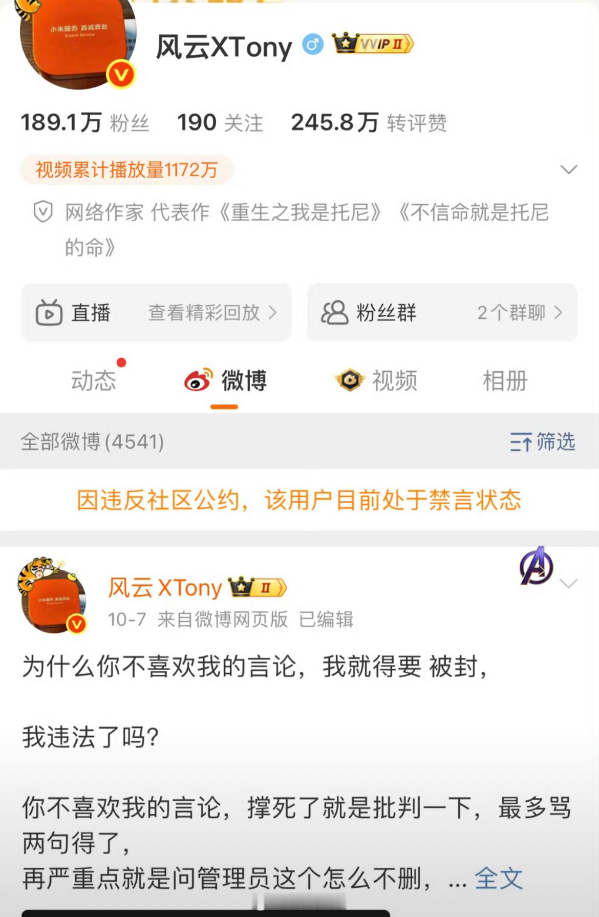 风云XTony上次刚被禁言一周出来,又开始了,这处罚一点作用没有起啊!