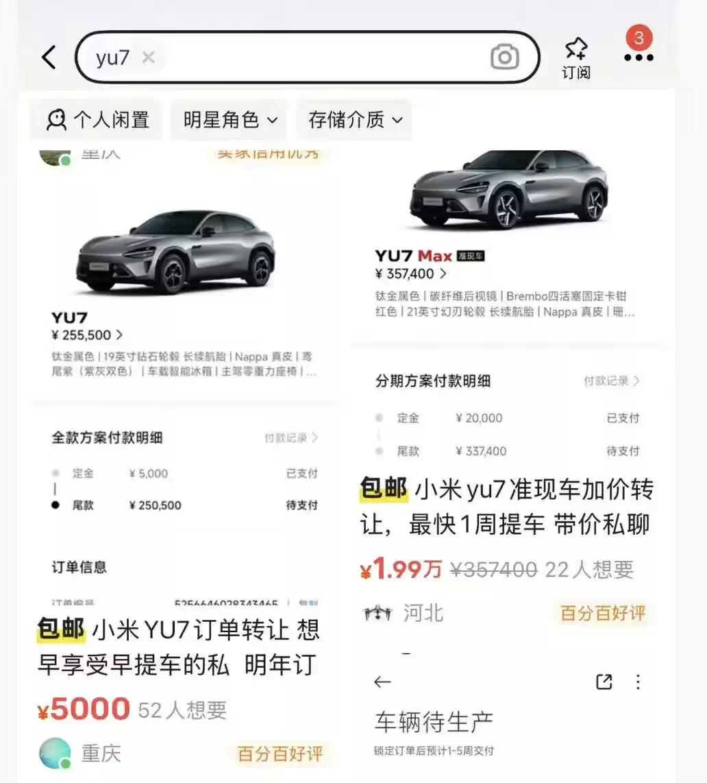 哪个产品火不火,看黄牛就得了!两个月前还被黄牛加价2万抢购的小米汽车订单,现在跌到只剩2000块?当初抢到订单的人,如今转手就亏3000,社交媒体上全是原价转单,却无人问津的哀嚎。狂热终归平静... 这波降温来得又快又猛。六月YU7上市时,3分钟狂卖20万台,订单转让一度炒到上万元。可到了九月,风向突变。车商直言,现在抛单的人太多,接盘的没几个。尤其是成都车祸之后,小米的网上风评也急转直下,问价的车主扎堆出现。 不过有意思的是,二手车市场却相对稳定。百公里内的准新车仍比新车贵1万,没跌破发行价。有车商说,小米车本身没问题,该买的还是会买。九月小米还卖了4万多台,稳居新势力第二。 说到底,产品终要回归真实价值。短期的情绪波动,终究压不过长期的口碑和市场检验。