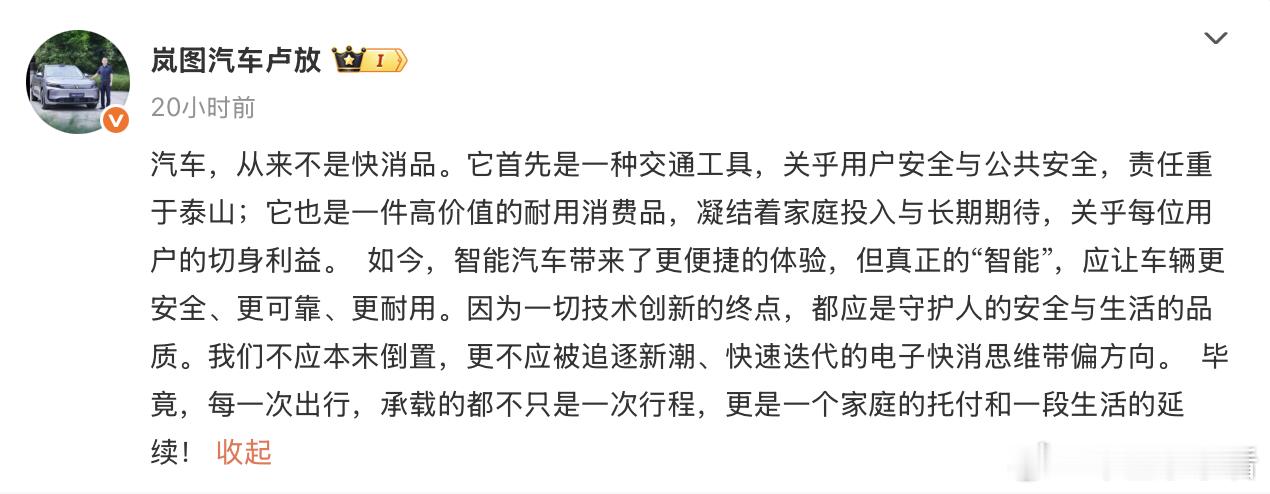 10 月 16 日消息,岚图汽车科技股份有限公司董事长、总经理卢放昨日在社交平台发文称,汽车,从来不是快消品。它首先是一种交通工具,关乎用户安全与公共安全,责任重于泰山。