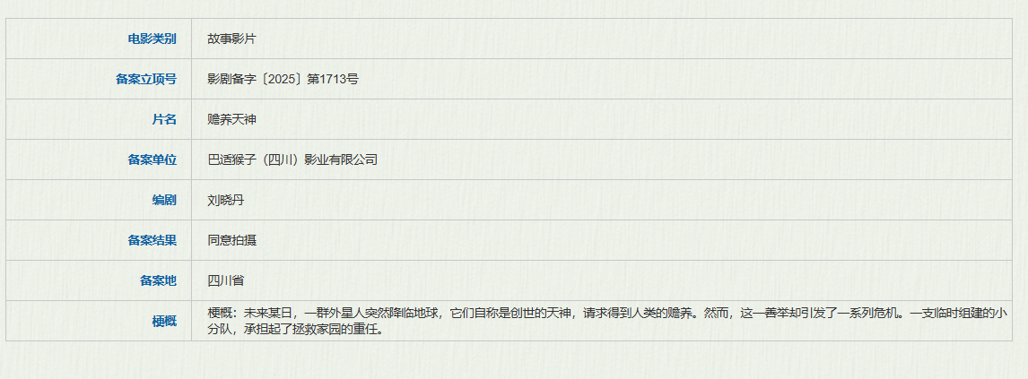 赡养天神备案据国家电影局关于2025年9月上全国电影剧本(梗概)备案、立项公示的通知,电影《赡养天神》备案立项。改编自刘慈欣小说《赡养上帝》,巴适猴子(四川)影业有限公司备案,编剧为刘晓丹(《疯狂的外星人》《红毯先生》《二手杰作》)。