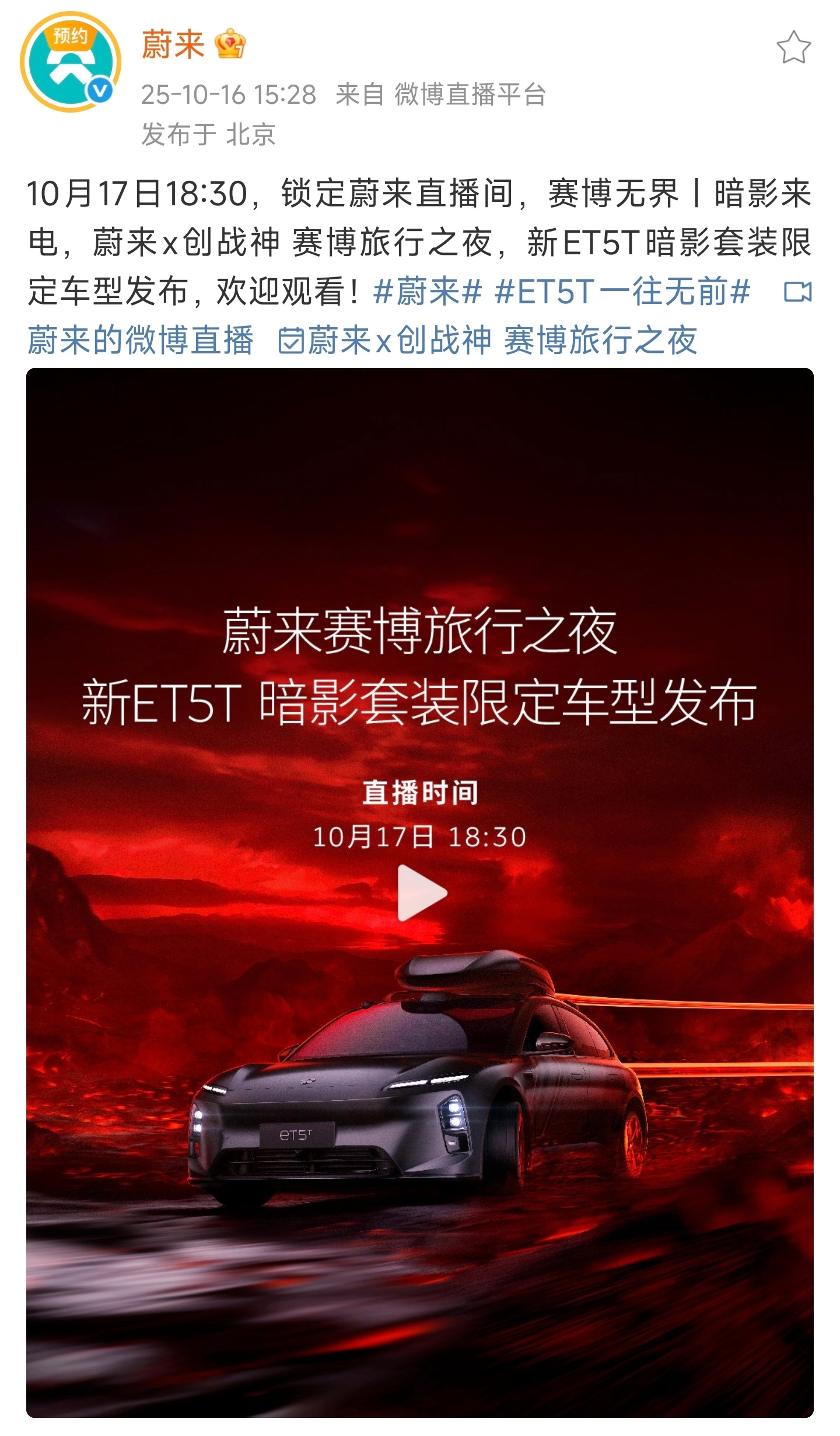 蔚来明晚会发布一款ET5T的暗影套装限定版,俗称“黑武士”。