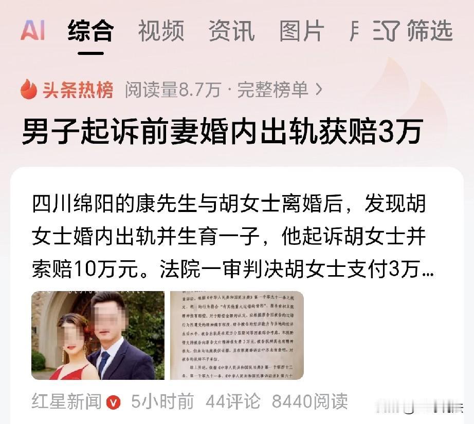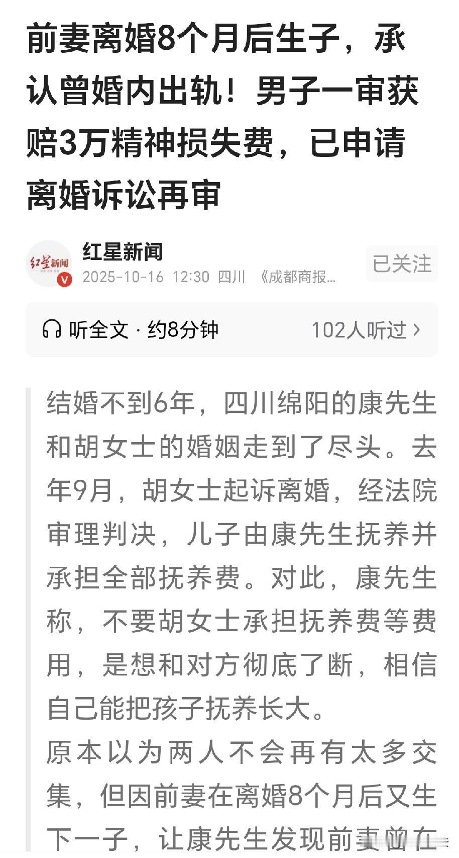 四川绵阳,一男子结婚6年,妻子提出离婚,儿子由男子抚养,男子不要妻子出抚养费,谁知离婚8个月,前妻又生孩子,男子奇怪,离婚前早已分居,他一算日子,没离婚时,前妻就和别人发生了关系,男子告到法院,要前妻赔偿他精 神损失费10万,一审判决,前妻赔他30000元,前妻不服,提起上诉,说他动辄殴打辱骂,自己也受到了精 神 伤害,男子申请离婚案再审,要求前妻一次付清儿子5~18岁抚养费224800元,并返还离婚时给她的车辆补偿款19000元! 2011年,康先生大学毕业,他在外面辗转打工,2016年,他思乡心切,回到了绵阳,在一家KTV做了一名客户经理。 可KTV上班,都是在晚上,他白天有大把的时间,于是,他就跑滴滴,还卖保险,希望自己能挣到更多的钱。 到了晚上,他再回去KTV上班,KTV灯红酒绿,很快就有人给他介绍对象。 胡女士和他同龄,2018年7月,两人正式交往,到了年底,俩人登记结婚。 2019年2月14日,在家人的祝福下,双方举行了隆重的婚礼,他们以为,从此就会相扶相依。 俩人租房居住,2019年11月,儿子出生,有了儿子,胡女士不能工作,忙前忙后,在家照顾孩子。 2019年3月,夫妻开始创业,他们开了花店和窗帘店,可生意不好,勉强支持到2022年,两个店都关门倒闭。 在这期间,康先生一直在KTV兼职,之后,康先生开着车四处售卖剩下的窗帘。 孩子大了,由老人帮忙看管,胡女士为了多些收入,她也重新出门上班。 由于生活琐事,康先生夫妻二人,感情慢慢有了问题,2023年12月,胡女士鼓起勇气,她向法院起诉离婚。 胡女士说,康先生婚后脾气不好,容易发怒,动辄对她拳脚相加。 胡女士认为,她和康先生感情已经破裂,请求法院判决离婚。 法官查明,婚内胡女士两次报警,但视频显示,二人只出现过拉扯,并未出现过康先生对她的殴打行为,于是,法院驳回了胡女士的起诉。 婚没离成,但是心已经散了,从这天起,康先生搬了出去,两人分居。 胡女士不甘心,2024年9月,她再次向法院起诉离婚,这次,如她所愿,9月24日,法院判决二人离婚。 儿子由父亲康先生抚养,康先生为了今后再不和胡女士纠缠,他不要胡女士出抚养费,全部由他自己承担。 家里的车辆,归康先生所有,康先生给胡女士1.9万元车辆补偿款,夫妻共同债务,胡女士和康先生各承担一半,俩人不再纠缠,决定好聚好散。 谁知离婚8个月后,康先生听说,胡女士待产,又要生孩子了,他一算日子,是在离婚前就怀上了身孕。 康先生大怒,那个时候,他早就和胡女士分居,这就说明,胡女士是在婚姻存续期间和别人发生了关系。 康先生家要拆迁,他要求胡女士3天内迁出户口,并要胡女士拿回来儿子的出生证和保险单等资料,因为一直没见到前妻,他还闹到了当地的派出所里。 康先生越想越气,今年7月,他告到法院,要求胡女士赔偿他精神损失费10万。 可胡女士认为,在婚姻存续期间,她受到康先生的殴打辱骂,威 胁,她也曾经被伤害,也有精 神损失。 但她承认是婚内和别人发生关系,和别人有了孩子,但她又称,她和康先生已经分居,感情早就没了。 《民法典》第1091条规定: 有下列情形之一,导致离婚的,无过错方有权请求损害赔偿:(五)有其他重大过错。 胡女士在离婚后8个月即和别人生育子女,其受孕时间发生在与康先生婚姻关系存续期间,违背了忠实义务,且直接导致婚姻破裂,属于其他重大过错的认定标准。 精 神 损害赔偿数额需结合过错程度、当地生活水平、侵权人经济能力等因素确定 。 9月16日,一审判决,胡女士向康先生赔偿3万元精 神损失费。 胡女士不服,向法院提起上诉。 康先生之前,没有要求胡女士承担儿子抚养费,但是他现在改主意了,要求再审, 他申请离婚诉讼再审,请求撤销之前的判决,他要求胡女士支付儿子5~18岁抚养费124800元。 另外,他还要求胡女士支付儿子学费医疗费10万元,两者合计224800元。 为了以后不再牵扯,他要求胡女士一次付清,同时要求返还车辆补偿款19000元。 《民法典》第1085条规定: 离婚后子女由一方直接抚养的,另一方应当负担部分或者全部抚养费。 康先生在离婚时虽表示不要胡女士出抚养费,但之后情况发生变化,他可以根据实际情况请求变更抚养费。 康先生要求胡女士一次支付儿子5-18岁抚养费224800元,法院会根据具体情况进行审查和判定。 康先生要求胡女士返还车辆补偿款19000元,若康先生能证明在离婚时分割车辆及支付补偿款存在显失公平,或者自己处于危困状态等,那他可以要求胡女士返还。 如果康先生不能证明显失公平,这个请求可能难以得到支持。 对此,你怎么看? 关注@王哥说法 多学法律少吃亏!