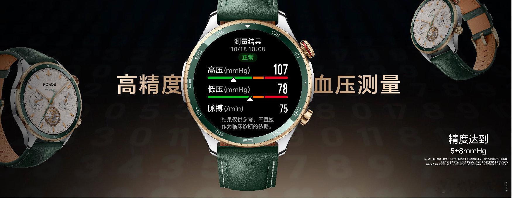 荣耀手表5Pro,一次校准便可主动测量血压,实时出值。方寸间精准测量,开启腕上
