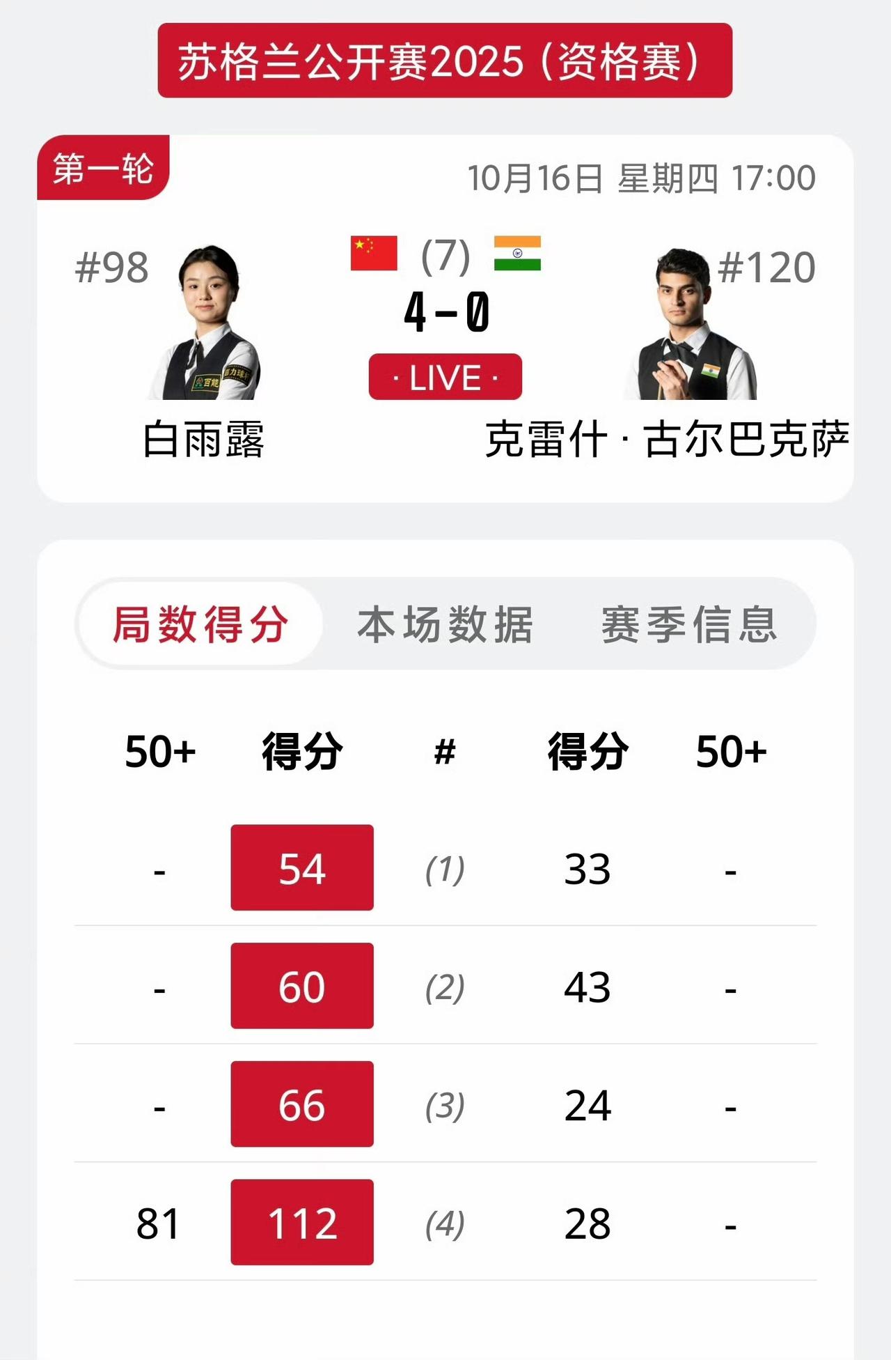 斯诺克苏格兰公开赛第一轮又有3名晋级的国手:常冰玉、高阳、白雨露。此前已有3名国手晋级正赛:蓝裕豪、江俊、刘宏宇。令人意外的是小白大胜晋级。 白雨露4-0古尔巴克萨 常冰玉4-2许医尘 高阳4-0本齐