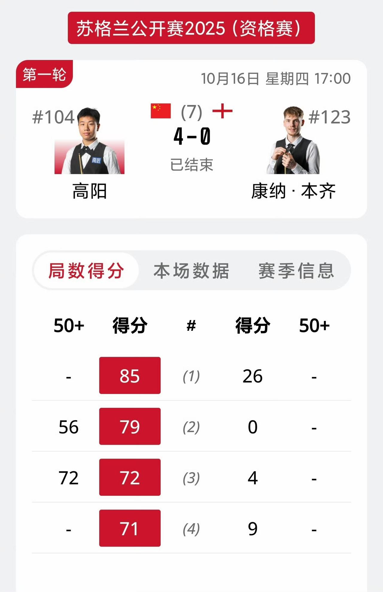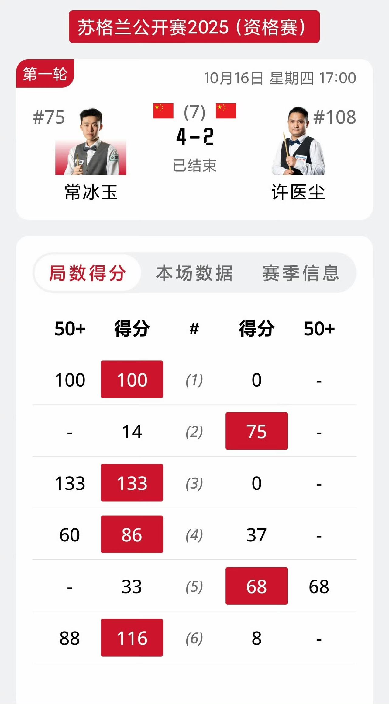 斯诺克苏格兰公开赛第一轮又有3名晋级的国手:常冰玉、高阳、白雨露。此前已有3名国