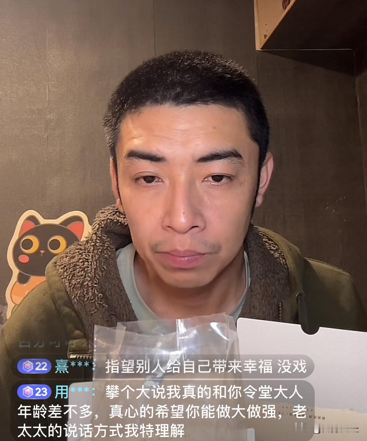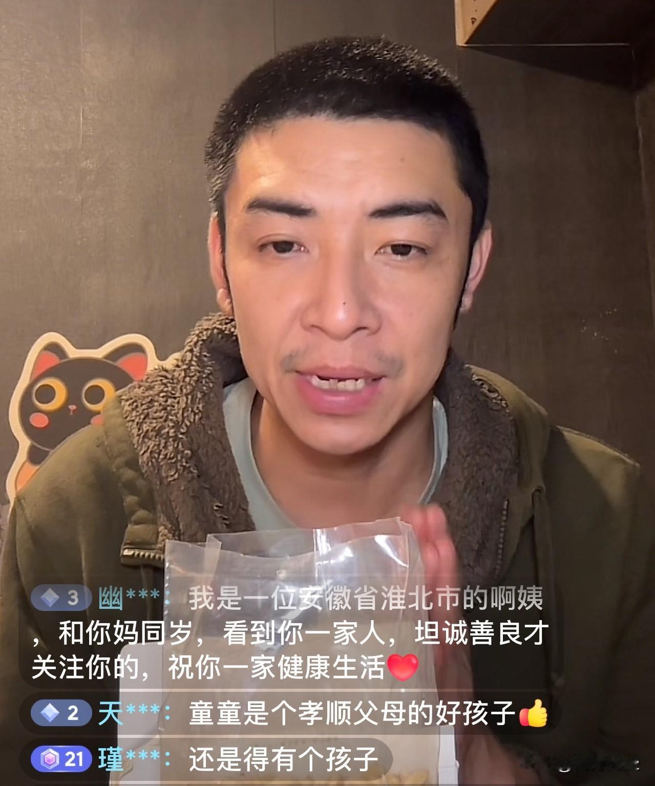 马品同的粉丝都有谁? 我记得是在夏天,有一天,马品同家换沙发套,直播间里一万人同时在线,看他和老母亲一起换沙发套。 又有一天,马品同说要打扫厨房,又是上万人同时观看。 好久不见,马品同的直播间热度怎么样了呢? 今天马品同在直播带货,直播间在线有500人左右。 马品同的粉丝都是些什么人呢? 从屏幕上滚动的字幕内容来看,与马品同互动的粉丝,有很多是和马品同父母年纪一般大的人。 有一位粉丝说:我和令堂大人年龄差不多,希望你做大做强,老太太的说话方式我特理解。 有一位粉丝说:我是安徽淮北的阿姨,我看到你一家人坦诚善良才关注你的。 还有人夸马品同是个孝顺的好孩子。 四十多岁的马品同,离异无孩,与父母同居在北京二环里的小平房,他们一家人的命运吸引着许多粉丝的关注。