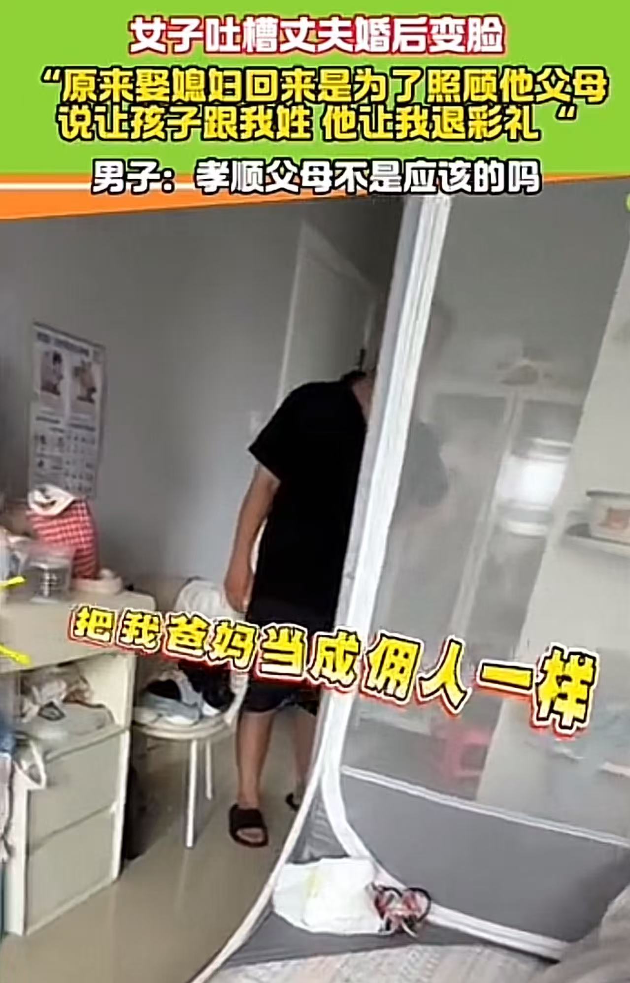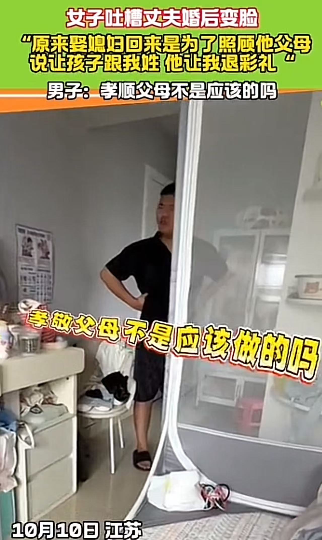 江苏:女子吐槽丈夫婚后变脸!女子:“他说娶媳妇回来是为了照顾他父母!说我不孝顺就让孩子跟我姓,让我退彩礼!”丈夫:孝顺父母不是应该的吗?而网友炸锅了,有网友说,这女的为啥网暴自己?也有网友说,男的在网暴自己才对,自己爸妈让别人照顾?