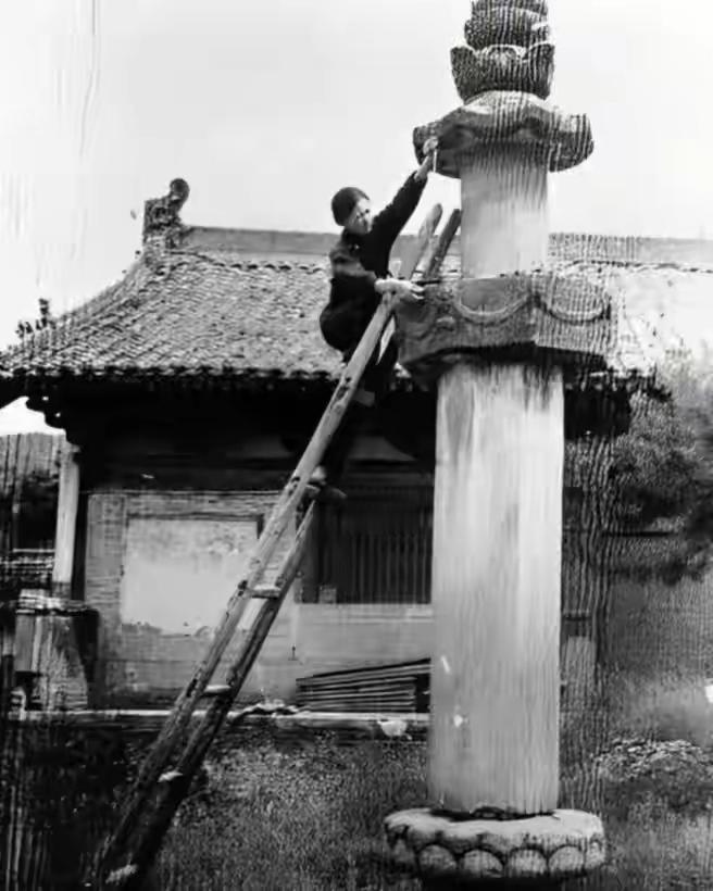 王铎:林徽因测量佛塔 林徽因从美国留学回国后,立即走遍全国,考察古建筑。 这是她在一个大殿前,登上梯子,正在测量佛塔的高度…… 你看她工作的多么认真啊!