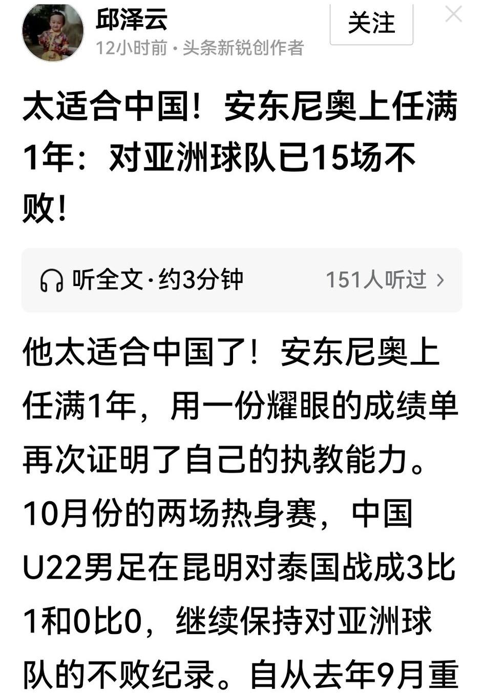 国足选帅难产,不如让这事先流产,再让安东尼奥十月怀胎一朝分娩。 从成绩看,安东尼奥一年来率u22国足在亚青赛和热身赛10胜5平保持不败,是各层级国足难得的亮点。 从经历看,他这七八年先后执教u15~u22,非常熟悉我们青训体系和当下年轻球员特点。 从目标看,国足2027才有亚洲杯正式比赛任务,接下来才是为2030世界杯备战,并不急着选个教练。 从优势看,来自西班牙的安东尼奥不是“维奇”,可以国足、国奥为主,再到国青、国少全面统筹贯穿,成为事实上的总教练,明年夏秋再以u22为基础,让他担任国足主教练。