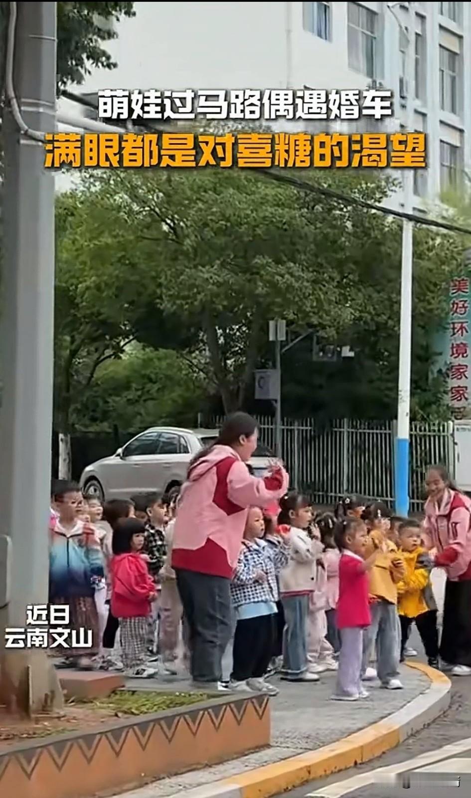 近日云南文山一群萌娃火了, 幼儿园老师带着一群小朋友出行, 马路上看到了婚车,