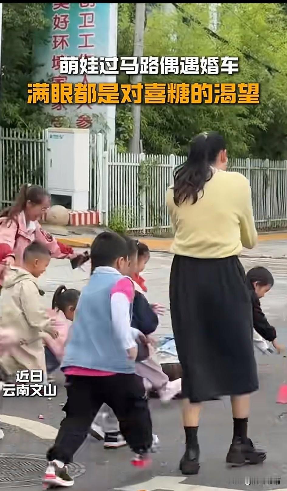 近日云南文山一群萌娃火了, 幼儿园老师带着一群小朋友出行, 马路上看到了婚车, 一群小朋友整日站着眼巴巴看着婚车, 还有小朋友在挥手, 满眼都是对喜糖的渴望, 婚车上的司机看到小朋友也是很高兴, 就放慢车速扔下了去了许多喜糖, 萌娃们迅速跑过去开始捡起了喜糖, 孩子们或许不知道结婚是干什么, 但是他们知道有喜糖可以吃, 司机也是很有爱, 老师也在一旁看护她们的安全, 捡到喜糖的宝宝开心坏了, 挥手谢谢司机! 这一幕也太好玩了! 大家觉得婚车遇到眼巴巴的萌娃好玩吗? 拦婚车要钱算抢劫吗 萌娃 家有萌娃 萌娃长成记 幼儿园