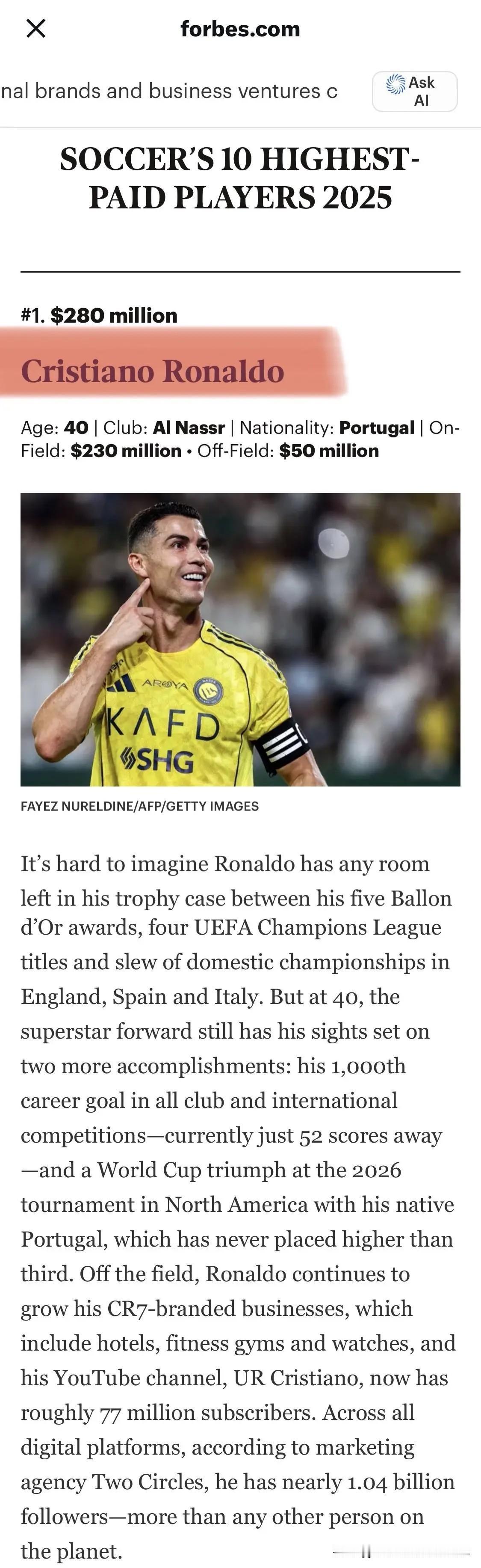 这个基本没悬念,不管是2025还是近几年,罗总裁都是坐稳这个第一宝座!毕竟仍然驰骋在职业赛场第一线且继续向1000球目标冲击,保持热度,老而弥坚,商业价值不减反增,他不拿第一谁拿? ——C罗,场上收入:2.3亿美元/场外收入:5000万美元 场外,罗纳尔多继续发展他的CR7品牌业务,包括酒店、健身房和手表,根据营销机构Two Circles的数据,他在所有数字平台上拥有近 10.4 亿粉丝,比地球上任何其他人都多