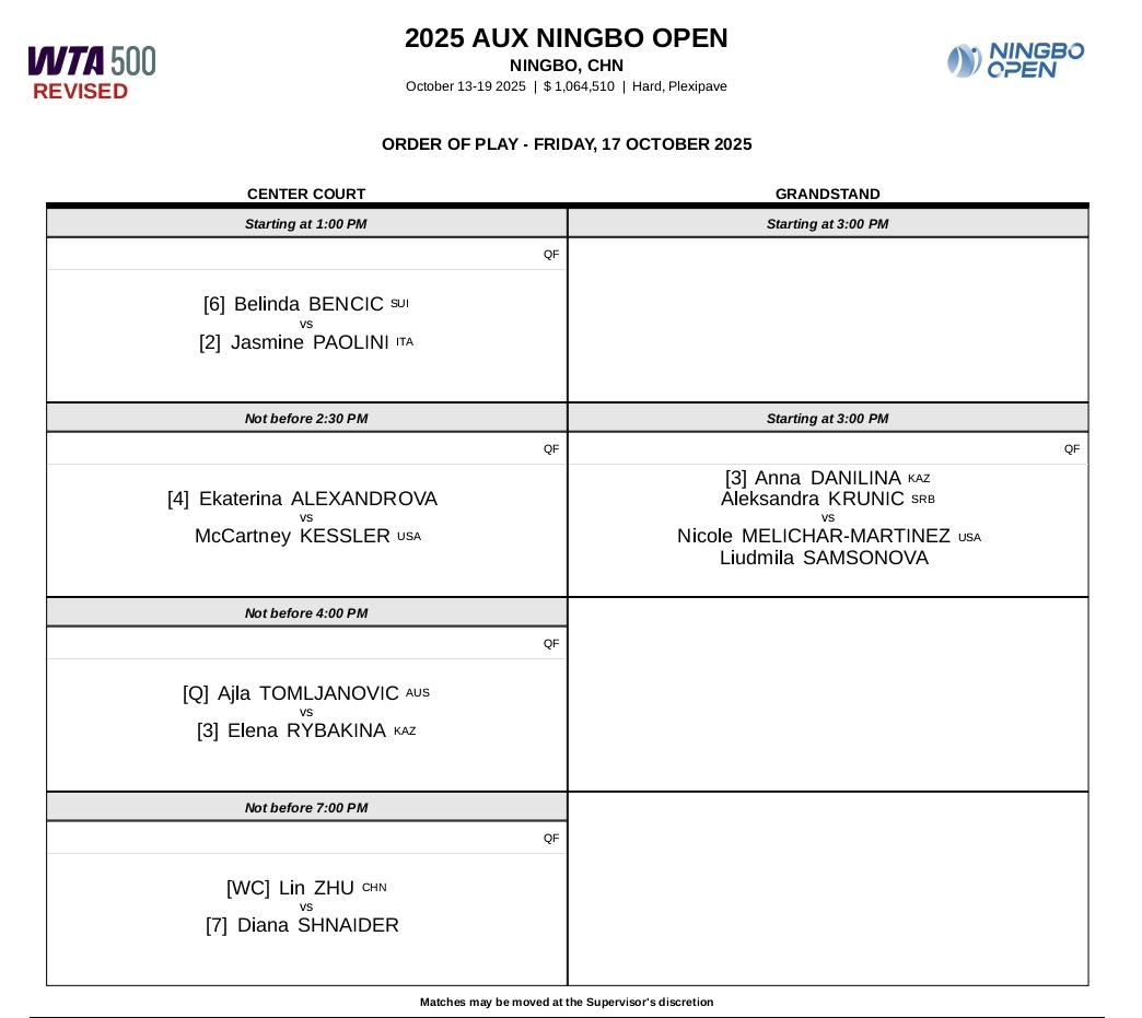2025奥克斯·宁波网球公开赛今日赛程📅