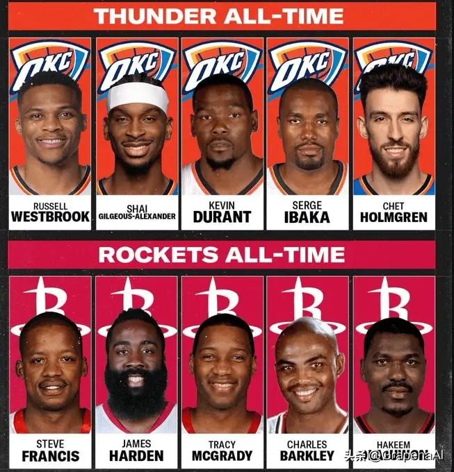 美媒Vator Sports更新动态,晒出一张照片与球迷分享。 “雷霆队史最佳阵容vs火箭队史最佳阵容,哪边能获胜?”Vator Sports发问道。 雷霆阵容为:威少、SGA、杜兰特、伊巴卡、霍姆格伦。 火箭阵容为:弗朗西斯、哈登、麦迪、巴克利和奥拉朱旺。