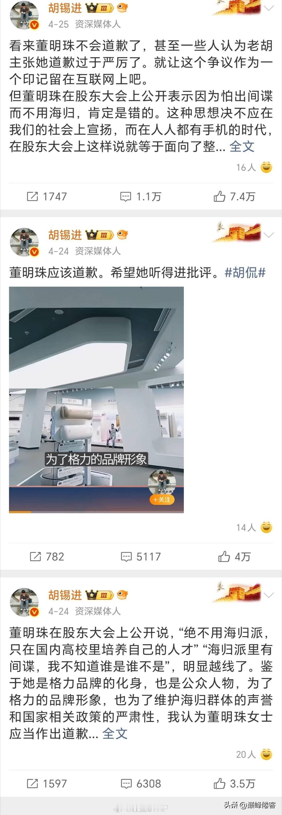 胡锡进又开始矫情了,说大家不敢发言了,说舆论环境苛责了云云。然而,胡锡进当初网曝董明珠的时候,言论自由的宽容度呢?那个时候,胡锡进不怕破坏营商环境了?那个时候,胡锡进不觉得网曝让人越来越小心不敢说话了? 舆论环境变差,就是胡锡进之流大肆撕咬扣帽子打棒子造成的!